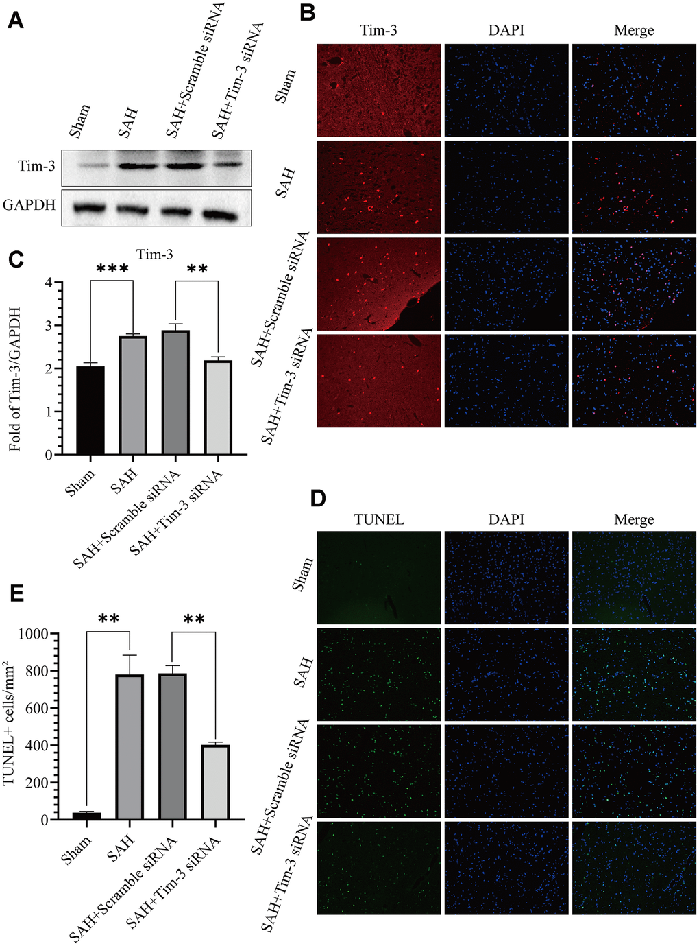 To further determine the effect of Tim-3 in EBI after SAH, we detected neurocyte apoptosis and release of related inflammatory factors after knocking down endogenous Tim-3 expression. Tim-3 siRNA was injected intravenously 48 h prior to SAH to knockdown of endogenous Tim-3 expression. Western blotting was used to measure transfection and knockdown efficiency. As shown in Figure 5A–5B, Tim-3 siRNA significantly reduced the expression of endogenous Tim-3 in the brain compared with the SAH groups; however, scramble siRNA had no effect on endogenous Tim-3 expression compared with the SAH groups. The results were also verified by immunofluorescence staining (Figure 5C). TUNEL staining showed that the number of TUNEL-positive cells in the ipsilateral hemisphere in the SAH+Tim-3 siRNA groups were decreased compared with SAH and SAH+Scramble siRNA groups (Figure 5D, 5E).
