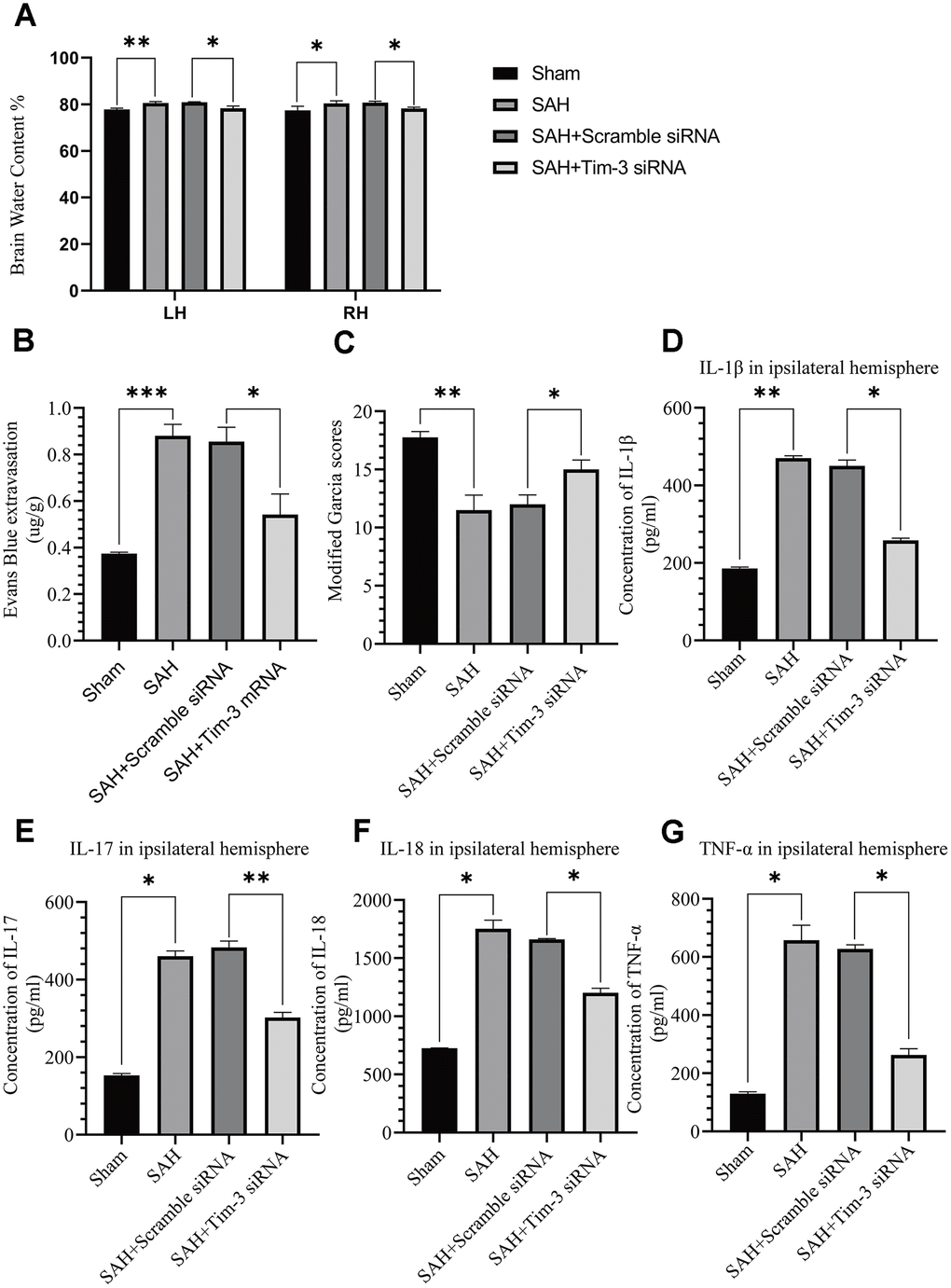 Tim-3 knockdown by siRNA alleviated brain edema, reduced BBB permeability, and improved short-term neurological functions and reduced inflammatory cytokine infiltration after SAH