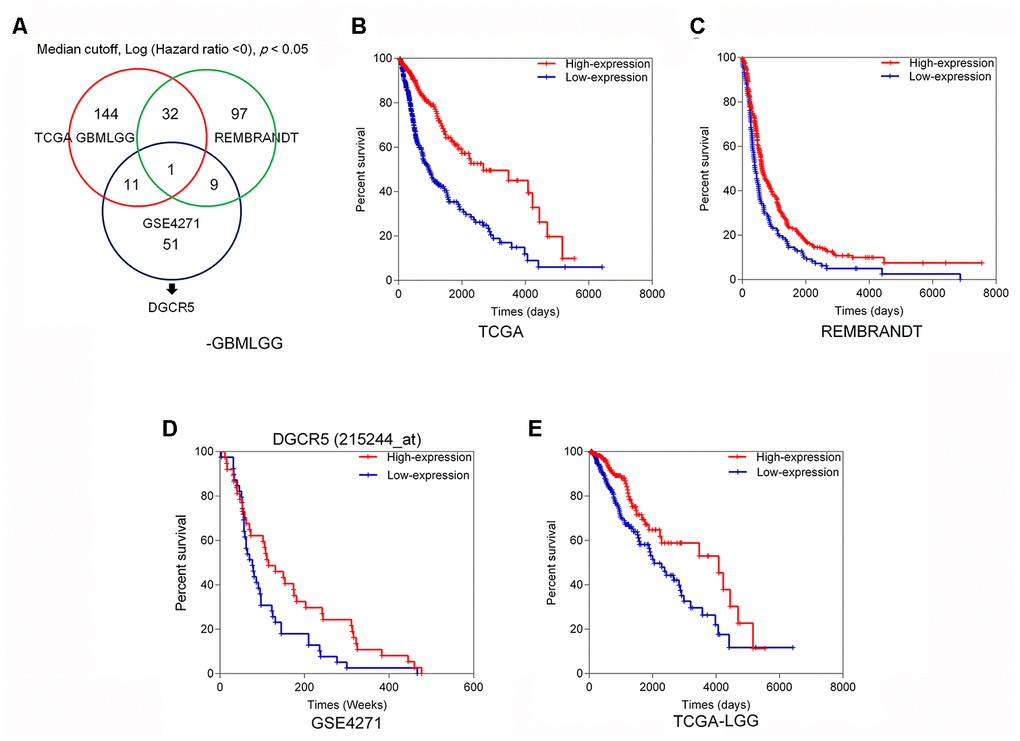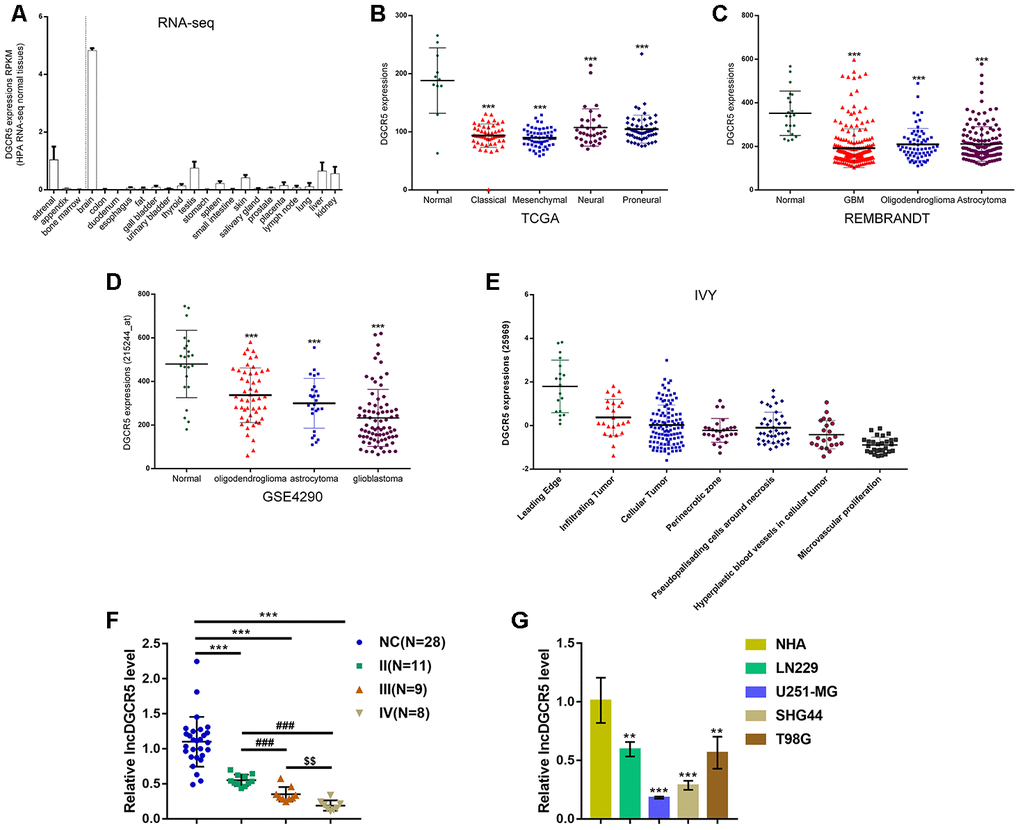 To confirm this hypothesis, we examined lncRNA DGCR5 expression under different grouping conditions. According to online HPA RNA-seq data, DGCR5 expression was specifically upregulated in brain tissues among 27 types of tissues from 95 persons (Figure 2A). According to TCGA data, the expression of lncRNA DGCR5 was reduced in proneural glioma, neural glioma, mesenchymal glioma, and classical glioma, compared with noncancerous (normal) tissue samples (Figure 2B). According to REMBRANDT data, lncRNA DGCR5 expression was dramatically downregulated in oligodendroglioma, astrocytoma, and glioblastoma, compared with normal (noncancerous) tissues (Figure 2C). According to GSE4290, lncRNA DGCR5 expression showed to be remarkably downregulated within oligodendroglioma, astrocytoma, and glioblastoma, in comparison with that in normal (non-cancerous) tissues (Figure 2D). According to Ivy Glioblastoma Atlas Project data, lncRNA DGCR5 expression was analyzed in different parts of glioma, including leading-edge, infiltrating carcinoma, perinecrotic zone, cellular tumor, pseudoproliferative cells surrounding necrosis, proliferative blood vessels in cell tumor, and microvascular proliferation glioma. Figure 2E shows that lncRNA DGCR5 expression was the highest in the leading edge, whereas it was the lowest in microvascular proliferation glioma. Since microvascular proliferation glioma is the most malignant and invasive, these data indicated that lncRNA DGCR5 expression continued to be downregulated with tumor progression.