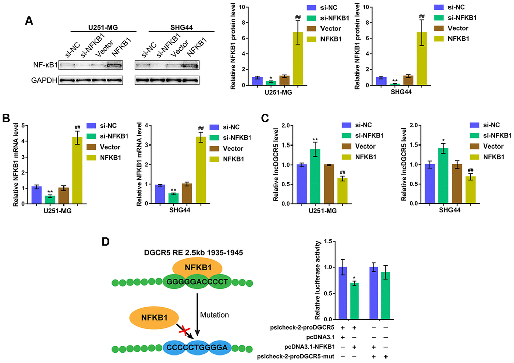 To verify the hypothesis, we overexpressed or silenced NF-κB1 in U251-MG and SHG44 cells by transfection of an NF-κB1-overexpressing vector or si-NF-κB1 and performed immunoblotting and real-time PCR to verify the transfection efficiency (Figure 3A, 3B). Then, DGCR5 expression was determined in NF-κB1 or si-NF-κB1 transfected glioma cells. As expected, NF-κB1 overexpression significantly inhibited DGCR5 expression, whereas NF-κB1 silencing promoted DGCR5 expression (Figure 3C). To verify the predicted binding between NF-κB1 and the NF-κB1 RE in the DGCR5 promoter region, two different types of psiCHECK-2-proDGCR5 luciferase reporter vectors, wild-type and mutant, were constructed as described (Figure 3D). We cotransfected these vectors into 293T cells with pcDNA3.1/NF-κB1 and examined luciferase activity. Figure 3D shows that psiCHECK-2-proDGCR5 luciferase activity was significantly decreased via the overexpression of NF-κB1. Mutating the predicted NF-κB1 RE in the DGCR5 promoter region abolished the alterations in luciferase activity (Figure 3D). Therefore, considering that NF-κB1 exerts an essential effect on the mediation of various major characteristics related to mesenchymal differentiation [29], we hypothesize that DGCR5 exerts an effect on mesenchymal differentiation] in glioma.