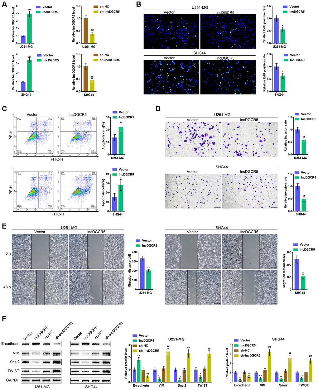 Next, we overexpressed and silenced lncRNA DGCR5 in U251-MG and SHG44 cells by transfection of the lncRNA DGCR5-overexpressing vector or short hairpin RNA (sh-DGCR5) and performed real-time PCR to verify the transfection efficiency (Figure 4A). Next, we examined the specific effects on glioma cells. LncRNA DGCR5 overexpression significantly inhibited the capacity of DNA synthesis (Figure 4B), invasion (Figure 4D) and migration (Figure 4E) in glioma cells, whereas it enhanced the apoptosis rate of glioma cells (Figure 4C). Regarding the signaling involved, the overexpression of lncRNA DGCR5 dramatically enhanced the protein levels of E-cadherin but inhibited the protein levels of VIM, Snai2, and TWIST (Figure 4F); in contrast, DGCR5 silencing significantly decreased E-cadherin protein but increased VIM, Snai2, and TWIST proteins (Figure 4F). In summary, lncRNA DGCR5 might inhibit the capacity of glioma cells to proliferate, migrate, and invade, thus exerting a tumor-suppressive effect.