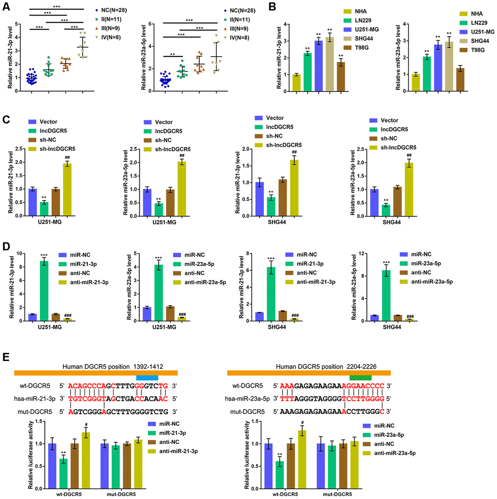 Commonly, lncRNAs exert an effect on the expression of miRNA-targeted mRNA via interaction with miRNAs. To further investigate the suppressive effects of lncRNA DGCR5 on the proliferation, migration, and invasion of glioma cells, we analyzed TCGA data to identify miRNAs that were negatively correlated with DGCR5. As shown in Supplementary Figure 4, miR-21 and miR-23a were negatively correlated with DGCR5. Reportedly, miR-21 is regarded as promising treatment target for glioma [36]. In addition, miR-23a is also implicated in promoting glioma cell proliferation [37]. In tissue samples, the expression of miR-21/miR-23a was significantly upregulated in glioma tissue samples (stage II, n=11; stage III, n=9; stage IV, n=8) compared with normal (noncancerous, n=28) tissues. Moreover, miR-21/miR-23a expression was higher in stage III tissue samples and highest in stage IV tissues (Figure 5A). Accordingly, the expression of miR-21/miR-23a was significantly upregulated in glioma cell lines compared with NHAs (Figure 5B). Moreover, online tools predicted that miR-21 and miR-23a might both be the downstream targets of DGCR5. To confirm that lncRNA DGCR5 negatively regulates miR-21/miR-23a, we transfected U251-MG and SHG44 cells with lncDGCR5 or sh-DGCR5 and examined the expression levels of miR-21/miR-23a. As shown in Figure 5C, lncRNA DGCR5 overexpression significantly downregulated, whereas lncRNA DGCR5 silencing significantly upregulated the expression levels of miR-21/miR-23a. Thus, we hypothesized that DGCR5 exerts its tumor-suppressive effects through miR-21/miR-23a.