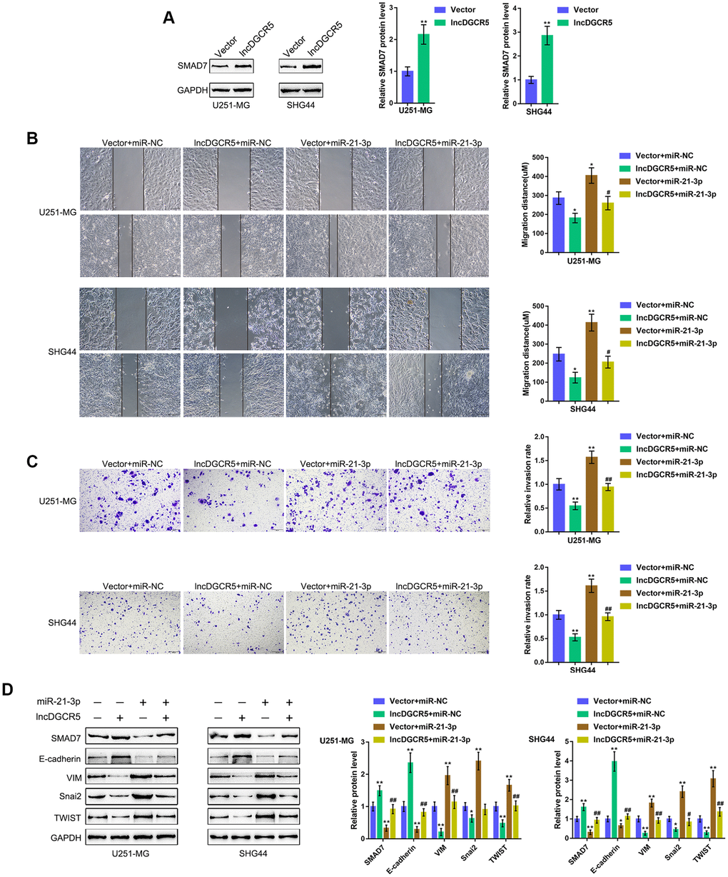 The effect of the miR-21/Smad7 axis has been found in many diseases [38–40]. Smad7 is a TGFβ1 signaling inhibitor and has been reported to inhibit TGFβ1-induced cancer cell epithelial-mesenchymal transition (EMT) and metastasis [41–43]. In the present study, Smad7 was identified as a direct downstream target of miR-21; thus, the cellular functions of miR-21 might be related to cancer cell migration and invasion. Moreover, online data also showed that DGCR5 expression was significantly positively correlated with Smad7 expression (Supplementary Figure 5A–5E). Thus, we investigated whether the DGCR5/miR-21 axis affects Smad7 to act on glioma cell migration and invasion. We transfected U251-MG and SHG44 cells with lncRNA DGCR5-overexpressing vector and examined Smad7 protein levels. Figure 6A shows that the overexpression of lncRNA DGCR5 remarkably increased Smad7 protein levels in both U251-MG and SHG44 cell lines. Second, we cotransfected U251-MG and SHG44 cells with DGCR5 and miR-21 mimic and evaluated their dynamic effects on glioma cells. In contrast to DGCR5 overexpression, the overexpression of miR-21 dramatically promoted the capacity of glioma cells to migrate and invade (Figure 6B, 6C). Moreover, the overexpression of miR-21 significantly attenuated the effects of DGCR5 overexpression (Figure 6B, 6C). Regarding the signaling involved, miR-21 overexpression significantly decreased Smad7 and E-cadherin proteins, but increased VIM, Snai2, and TWIST proteins (Figure 6D). Accordingly, the overexpression of miR-21 significantly attenuated the effects of DGCR5 overexpression on these protein levels (Figure 6D). In summary, the DGCR5/miR-21 axis affects glioma cell migration, invasion, and EMT through Smad7.
