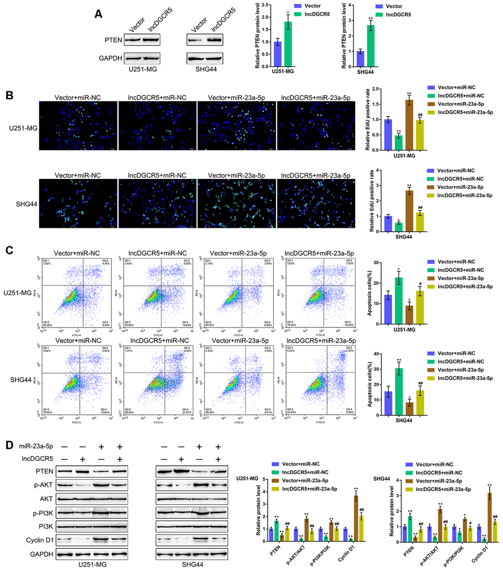PTEN is often knocked down in glioma cells and has been identified as a miR-23a downstream target in glioma [44]. Similarly, online data demonstrated a significant positive correlation between DGCR5 expression and PTEN expression (Supplementary Figure 6A–6D). The tumor-suppressor activity of PTEN depends largely on its lipid phosphatase activity, which inhibits PI3K/AKT activation. Activated AKT has many downstream effects, including the promotion of cell proliferation, increase in cellular glycolytic flux, and inhibition of apoptosis. PTEN antagonizes this survival/proliferative paradigm [45, 46]. In the present study, PTEN was identified as a direct downstream target of miR-23a; thus, the cellular functions of miR-23a might be related to cancer cell survival/proliferation/apoptosis. Therefore, we speculated that the DGCR5/miR-23a axis might affect PTEN to act on glioma cell proliferation and apoptosis. To verify this hypothesis, we transfected U251-MG and SHG44 cells with the lncRNA DGCR5-overexpressing vector and evaluated PTEN proteins. As shown in Figure 7A, DGCR5 overexpression markedly enhanced PTEN protein levels in the two glioma cell lines. Second, we cotransfected U251-MG and SHG44 cells with DGCR5 and miR-23a mimic and evaluated the dynamic effects of DGCR5 and miR-23a overexpression. miR-23a overexpression significantly increased glioma cell proliferation, and enhanced glioma cell apoptosis (Figure 7B, 7C). Moreover, the overexpression of miR-23a dramatically attenuated the effects of DGCR5 overexpression (Figure 7B, 7C). Regarding the signaling involved, miR-23a overexpression significantly decreased the protein levels of PTEN, increased AKT and PI3K phosphorylation and increased Cyclin D1 protein levels (Figure 7D). Similarly, the overexpression of miR-23a significantly attenuated the effects of DGCR5 overexpression on these protein levels (Figure 7D). In summary, the DGCR5/miR-23a axis affects glioma cell proliferation and apoptosis through PTEN/PI3K/AKT.