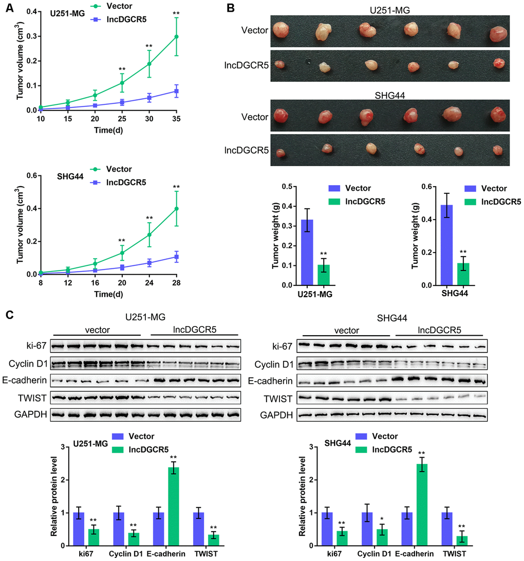 To further confirm these in vitro findings, we established an orthotopic implanted xenograft mouse model. We examined the effects of lncRNA DGCR5 on tumor growth, proliferation markers, cell cycle regulators, and EMT markers. As shown in Figure 8A–8B, lncRNA DGCR5 overexpression significantly reduced the tumor volume and weight of both U251-MG-derived and SHG44-derived tumors. Moreover, DGCR5 overexpression significantly decreased the protein levels of proliferation marker ki-67, cell cycle regulator Cyclin D1, and mesenchymal marker TWIST, but increased the protein level of the epithelial marker E-cadherin in tumor tissues (Figure 8C). These data indicate that lncRNA DGCR5 acts as a tumor-suppressor to inhibit glioma tumor growth in vivo.