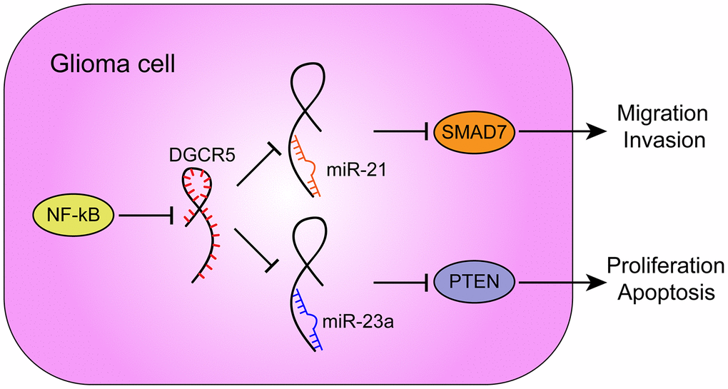 In conclusion, lncRNA DGCR5 suppresses the capacity of glioma cells to migrate and to invade via miR-21/Smad7, and it inhibits the proliferation and enhances the apoptosis of glioma cells through miR-23a/PTEN.