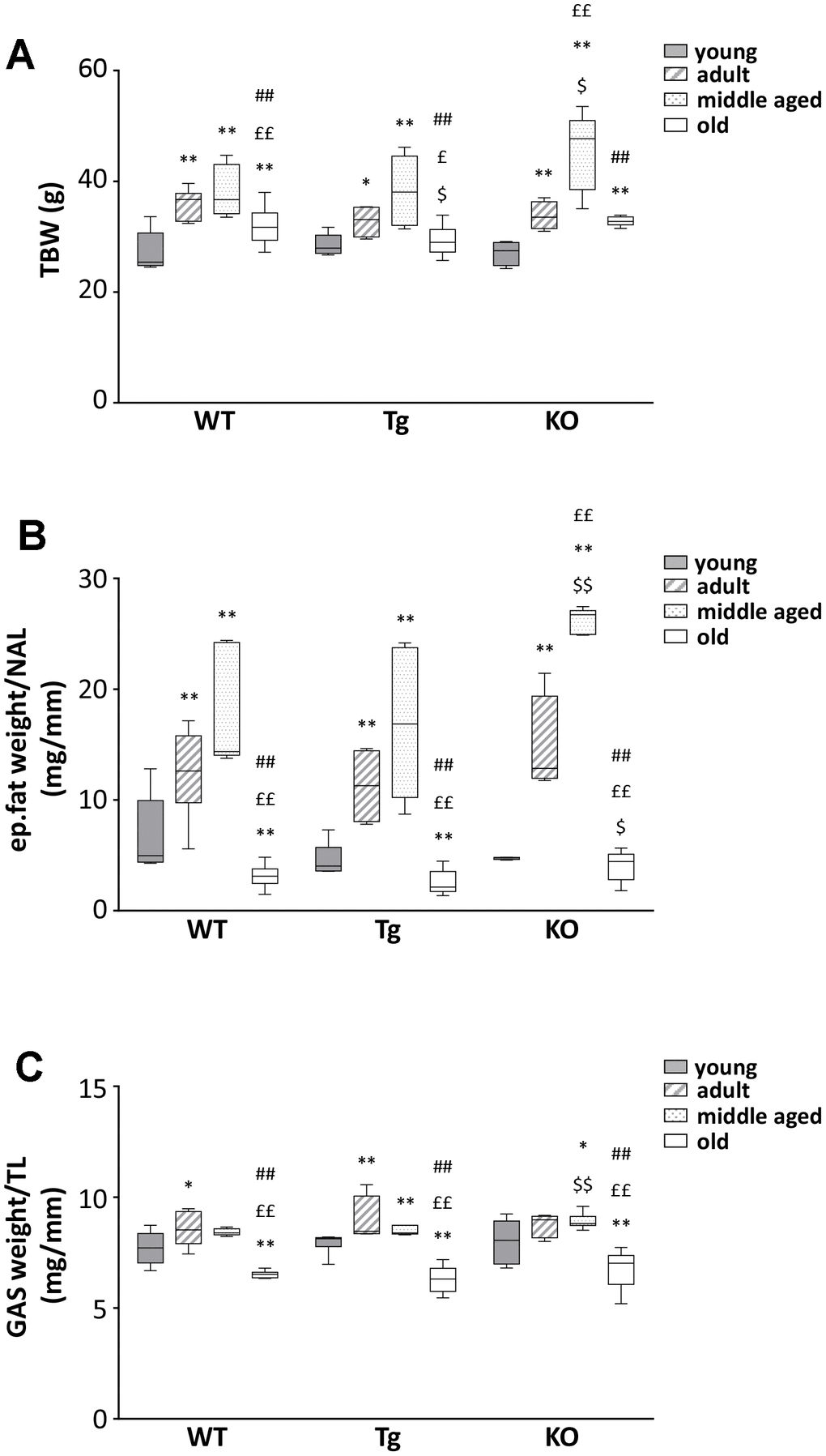 | Young (WT = 6, Tg = 7, Ghrl KO = 5), adult (WT = 7, Tg = 4, Ghrl KO = 5), middle aged (WT = 5, Tg = 6, Ghrl KO = 9), old (WT = 13, Tg = 14, Ghrl KO = 11) mice were sacrificed and measurements of the indicated parameters were carried out as described in Materials and Methods. Muscle mass and tibial length values were calculated as the mean of right and left hindlimbs. Values are the means ± SEM; *p<0.05 and **p<0.01 vs. young mice; £p<0.05 and ££p<0.01 vs. adult mice; #p<0.05 and ##p<0.01 vs. middle aged mice; $p<0.05 and $$p<0.01 Tg and Ghrl KO vs. WT. | |||||||||||||||||||||||||||||||||||||||||||||||||||||||||||||||||||||||||||||||||||||||||||||||||||