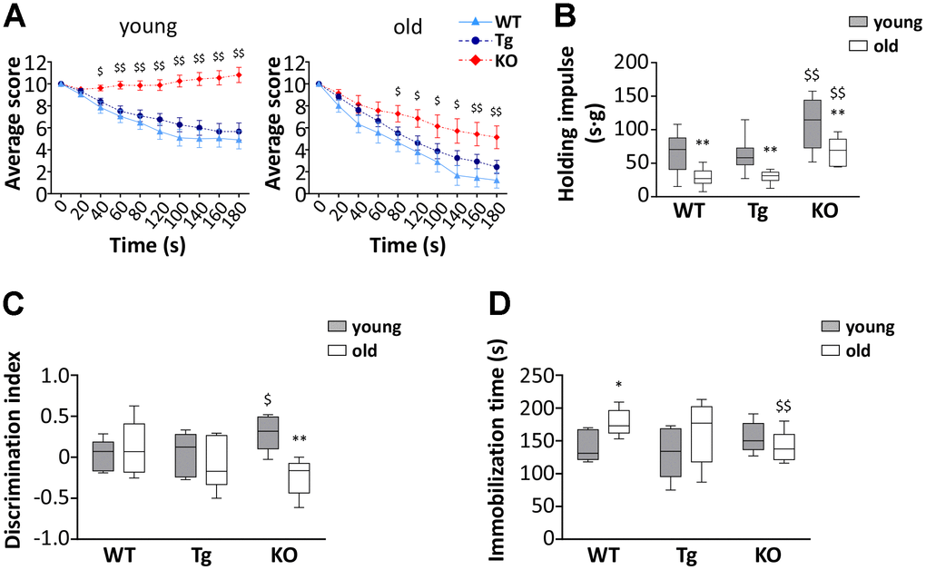 Since the score on the hanging wire test could be affected by cognitive performance and stress susceptibility, we assessed if cognitive capability and anxiety/depression of mice were different among the strains. Young Ghrl KO mice undergoing the object recognition test obtained a higher discrimination index than young WT and Tg (Figure 3C). However, at 24 months of age, while no significant changes were observed in the discrimination index of WT and Tg mice, that of Ghrl KO mice dropped to a level similar to those of WT mice. The tail suspension test, with the time spent immobile representing a measure of anguish, showed no differences in the immobility time of young mice (Figure 3D). During aging, both WT and Tg mice had a propensity to develop depression-like behaviors, while Ghrl KO mice showed substantial preservation of the immobility time during aging.