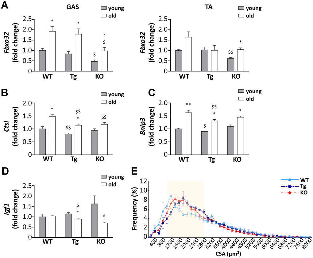 Despite the lack of significant differences in the weight of muscles among the three genotypes and the general decrease in muscle mass in aged mice (Figure 2C and Table 1), a closer examination of muscles revealed differences in the expression of Atrogin-1 (Fbxo32), a marker and a mediator of muscle atrophy, during aging [23]. The age-dependent increase of Atrogin-1 mRNA expressions was remarkable in gastrocnemii of WT and Tg mice and was milder in Ghrl KO mice (Figure 4A), although it should be considered that Atrogin-1 mRNA levels were basally lower in young Ghrl KO mice compared to the other genotypes. This was also true in tibialis anterior (TA) muscles, where Atrogin-1 was significantly increased during aging only in Ghrl KO mice, reaching the values of young WT and Tg animals. Conversely, the increase of Atrogin-1 during aging was not significant in WT and absent in Tg animals. The mRNA expression of other markers of autophagic-mediated catabolism, such as cathepsin-L and Bnip-3, showed a general tendency to increase with aging in all genotypes (Figure 4B, 4C), although the increase in cathepsin-L was significant only in WT and Tg mice. In the aged groups, cathepsin-L gene expression in both Tg and Ghrl KO mice was reduced compared to the WT animals, while Bnip-3 levels significantly decreased only in Tg mice. On the contrary, the expression of the anabolic marker IGF1 showed the general tendency to decrease with aging in Tg and Ghrl KO mice, although the reduction was significant only in the former (Figure 4D). Nevertheless, in old animals, Ghrl KO mice displayed a statistically significant lower expression of IGF1 compared to WT mice. Analyzing the fiber cross-sectional area distributions of gastrocnemius (GAS) muscles from young adult and old WT mice, it was evident a clear shift toward smaller areas in the latter (Supplementary Figure 1). Since the muscles of young Tg and KO mice, in unstimulated conditions, do not differ from those of WT animals [13, 22], the shift towards larger areas in old Tg and Ghrl KO muscles compared to old WT muscles (Figure 4E) indicates that both high levels of circulating UnAG and the lack of ghrelin peptides protect against muscle mass loss during aging.