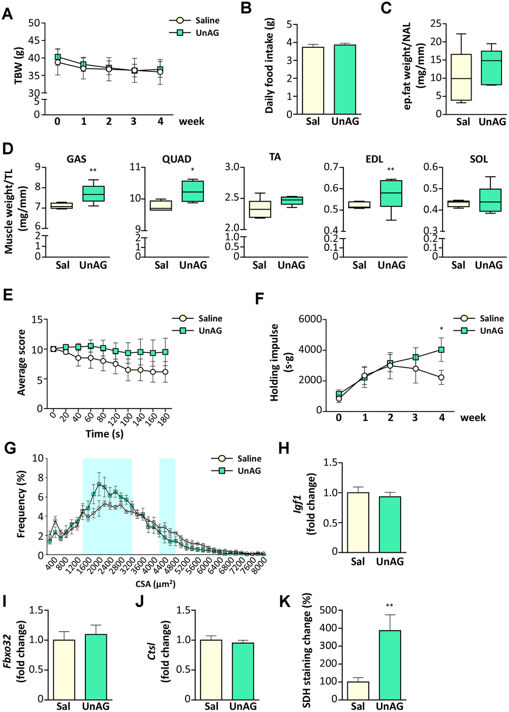 Old WT mice were treated with UnAG (100 μg/kg intraperitoneally once a day) for 28 days and compared to age- and weight-matched controls treated with saline. UnAG administration had no significant effect on total body weight (Figure 7A), daily food intake (Figure 7B), and epidydimal fat (Figure 7C). On the other hand, muscle weights showed a tendency towards higher values in UnAG-treated mice that were significant in gastrocnemii, quadriceps, an d EDL muscles (Figure 7D). UnAG progressively increased the physical performance of mice, seen as “falls and reach” score and holding impulse in the hanging wire test (Figure 7E, 7F). The difference in the holding impulse in UnAG-treated mice reached statistical significance at 28 days. However, at the end of the experimental period, there was no shift towards larger cross-sectional areas of gastrocnemius fibers, although the shape of UnAG-treated muscle distribution showed an increment of middle-sized fibers (Figure 7G). Despite the increase in muscle weight (Figure 7D), UnAG did not alter the expression of IGF-1 (Figure 7H). Furthermore, UnAG treatment was unable to decrease the expression of Atrogin-1 and cathepsin-L (Figure 7I, 7J). Since the better muscle performance could derive from a shift in muscle metabolism, we assessed SDH activity in gastrocnemii and observed that, indeed, UnAG induced a substantial increase in SDH staining in muscles (Figure 7K).