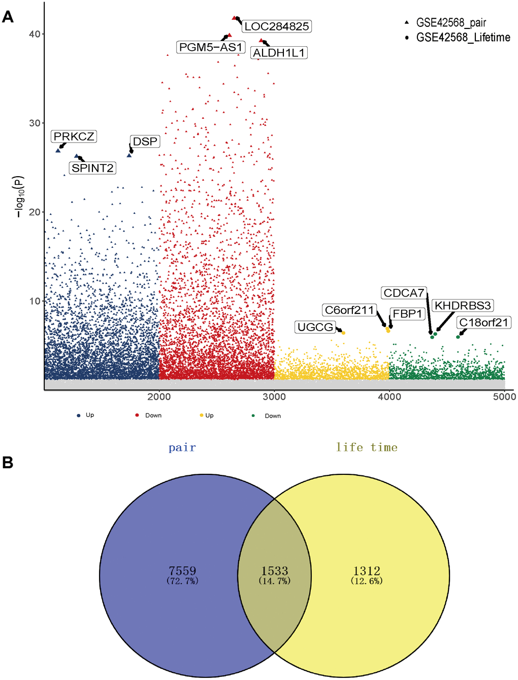The study flowchart is presented in Figure 1. To find genes related to the survival time of breast cancer patients, we first performed PCA on the whole sample of GSE42568 in the GEO database. We found that tumour samples and non-tumour samples were independent of each other, indicating that in-depth study of disease samples will be unaffected by the control samples (Supplementary Figure 1A). We further analysed samples of breast cancer patients with a survival time of longer than 5 years and shorter than 5 years, and there were also differences between the samples (Supplementary Figure 1B). Then, we analysed the differentially expressed genes (DEGs) between breast cancer patients and controls (pair) and obtained 9093 DEGs (Supplementary Table 1, Figure 2A). These genes may be related to the occurrence and development of breast cancer. More importantly, we compared the gene expression between patients with a survival time greater than 5 years and patients with a survival time less than 5 years (lifetime). Overall, 2845 DEGs (Supplementary Table 2, Figure 2A) were identified. These genes may be related to the longer survival time of breast cancer. Therefore, we screened 1533 common genes of the two groups of differentially expressed genes (Figure 2B), which may be related to breast cancer and can be used to judge the survival time of breast cancer patients.