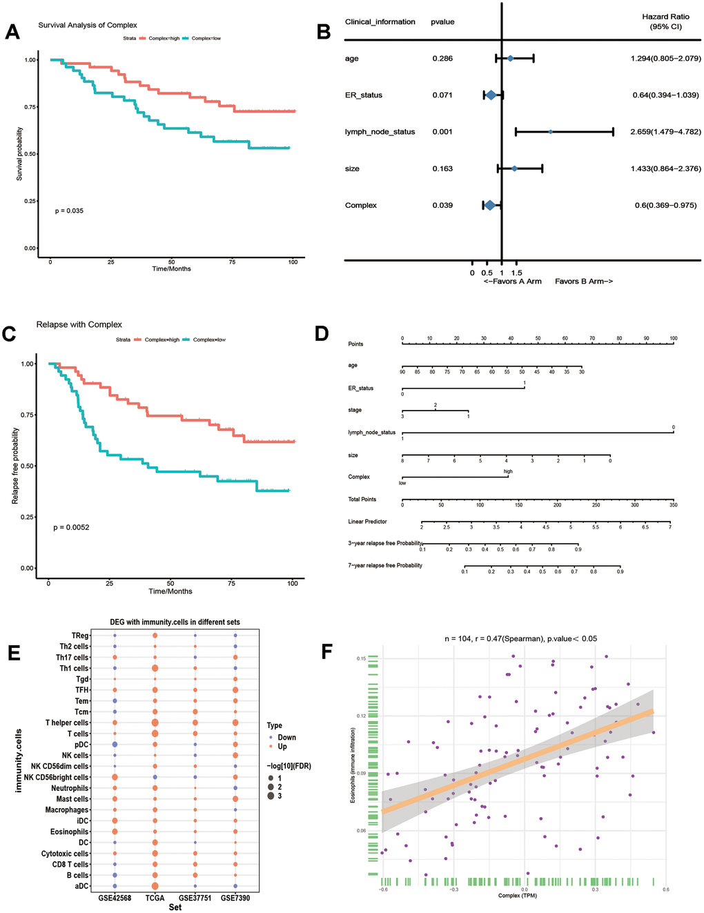 To evaluate the role of all 10 genes in the prognosis of breast cancer, we combined 10 genes into a complex through GSVA and found that the complex significantly affected the overall survival of breast cancer patients (Figure 4A). Single factor Cox regression analysis showed that lymph node status was a strong risk factor for breast cancer prognosis (Figure 4B). Kaplan-Meier relapse analysis for breast cancer patients according to complex expression levels showed that the complex influenced relapse-free breast cancer (Figure 4C). We used a Cox regression model for multivariate relapse analysis and a Cox regression coefficient to generate a nomogram (Figure 4D). In multivariate relapse analysis, age, ER status, stage, lymph node status, size and complex expression levels were considered as risk factors for relapse. The nomogram predicted the relapse probability of breast cancer patients in 3 and 7 years. The results showed that the low level of complex expression was closely related to the relapse rate of breast cancer patients. In addition, the difference of immune cells in different survival time of breast cancer was calculated (Figure 4E). A variety of immune cells were up-regulated in four groups of data. In the correlation analysis with immune cells, we found that the complex had the highest positive correlation with eosinophils (Figure 4F). Therefore, these key gene complexes are related to the prognosis of breast cancer as well as the relapse.