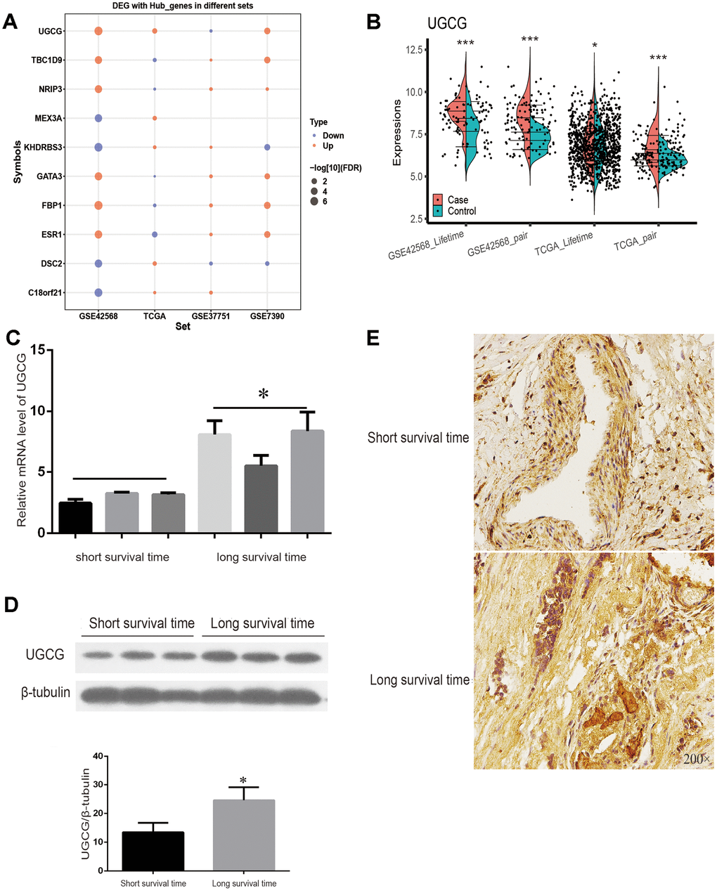 Through the public data of TCGA, GSE37751 and GSE7390, the expression trend of 10 genes in breast cancer patients with long and short survival times were verified. (Figure 7A). Among them, the mRNA level of UGCG was significantly different in the two groups of datasets (P < 0.05) (Figure 7B). The data show that UGCG mRNA expression was significantly correlated with breast cancer disease and positively correlated with breast cancer prognosis. Therefore, UGCG plays a major role in the prediction of survival time of breast cancer. To further verify the explicit correlation between UGCG and long-term survival of breast cancer patients, we carried out qPCR, Western blot and immunohistochemistry experiments. Surprisingly, the experimental results are consistent with the expectations. The transcription of UGCG in breast cancer patients with a survival time of longer than 5 years was significantly higher than that of breast cancer patients with a survival time of shorter than 5 years (Figure 7C). Western blot (Figure 7D) and immunohistochemistry (Figure 7E) also confirmed the expression of UGCG. These data indicate that UGCG may be a biomarker to predict the survival time of breast cancer patients.