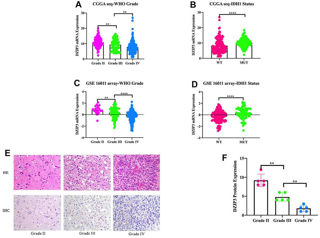 DZIP3 expression was downregulated in GBM and IDH1 wild-type glioma