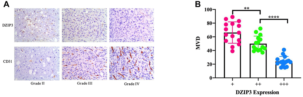 Based on the aforementioned results, DZIP3 affected the key biological functions to change the malignancy of glioma. A total of 261 genes were found to be significantly negatively related with the expression of DZIP3 as assessed by Pearson’s correlation analysis (Pearson |R| > 0.4) in the CGGA RNA-seq and GSE 16011 array cohorts to explore the biological roles of DZIP3 in gliomas (Figure 2A). Next, we performed GO analysis via DAVID Bioinformatics Resources 6.8 to clarify the biological functions of the related genes mentioned above. The results indicated that genes, negatively associated with DZIP3, were primarily involved in angiogenesis (Figure 2B). IHC was used to evaluate the correlation between DZIP3 expression and CD31 (a novel angiogenesis marker) [14]; DZIP3 mainly expressed on vascular endothelial cells and was negatively associated with CD31 at the protein level indicating that DZIP3 could affect the angiogenesis process of glioma (Figure 3A). Moreover, MVD of CD31 immunoreactivity was performed as described, we found that CD31-MVD was significantly lower in patients with higher DZIP3 expression (Figure 3B).