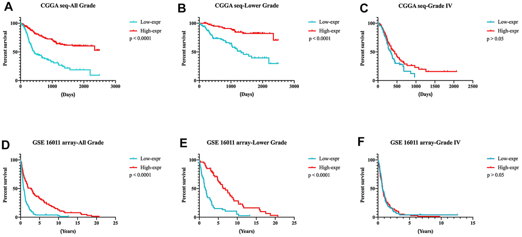In the CGGA RNA-seq set (training set), glioma patients were divided into two groups based on the median expression of DZIP3. Figure 4A, 4B showed that in both all grade and lower grade gliomas, patients in higher DZIP3 expression groups possessed significantly longer survival time than lower expression counterparts (p < 0.0001). However, we cannot attain a similar tendency in the GBM group (Figure 4C, p > 0.05). Furthermore, the results above in the glioma patients from GSE 16011 array set were validated (Figure 4D–4F). Then, Cox regression analysis verified the independence of the clinical prognostic significance of DZIP3 in glioma after adjusting age at diagnosis and WHO grade and IDH1 status in both all grade and lower grade glioma in CGGA RNA-seq cohort (Table 1). These results indicated that DZIP3 plays a crucial biological function in gliomas, especially lower-grade glioma.