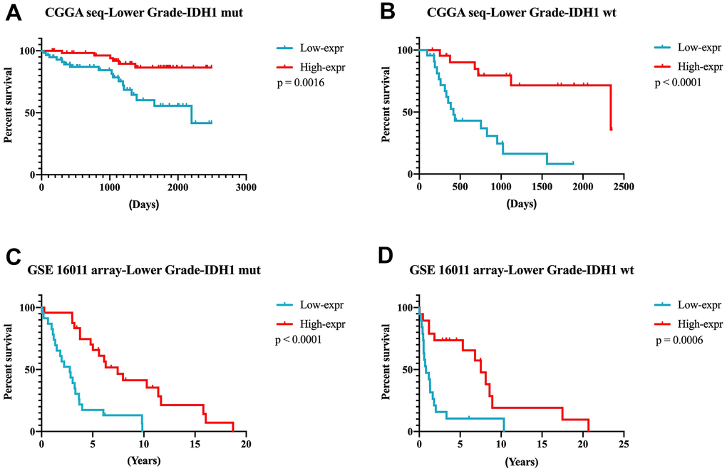 Gliomas are the most common and deadliest malignant primary brain tumor in adults and accounts for approximately 80% of the primary malignant tumors in the central nervous system [1]. Based on the World Health Organization (WHO) classification criteria, diffuse glioma could be divided into grades II–IV. Lower-grade gliomas (LGGs), designated as astrocytoma, oligodendroglioma, and mixed oligoastrocytoma of grade II and III, account for approximately 43.2% of all gliomas diagnosed in adults [2, 3]. Glioblastoma (GBM) is the most malignant glioma, which refers to WHO grade IV glioma. Despite advances in comprehensive therapy, such as neurosurgical resection, adjuvant radiotherapy, and alkylating agent temozolomide chemotherapy, patients who suffer from gliomas have a short median survival time due to various reasons [4, 5]. The degree of genetic and phenotypic variations of the glioma cells form intratumoral heterogeneity, allows the most adaptive tumor clones to develop treatment resistance [6]. In order to overcome this issue, hundreds of molecular alterations have been identified in grade II, III, and IV gliomas [7]. Isocitrate dehydrogenase 1 (IDH1) mutation, which occurs early in gliomagenesis, especially for WHO grade II and III gliomas, is an acknowledged molecular alteration [8]. Mutation in IDH1 is a stable marker indicating prognosis in both LGGs and GBM with the incidence of 75% and 12%, respectively [9, 10]. However, previous studies have established gene signatures to divide the IDH1 mutation glioma patients with different clinical features into various groups [9, 11]. However, only a few studies have focused on the wild-type IDH1 patients. Therefore, there is an urgent need to identify specific genes for novel diagnosis and therapeutic strategies for human gliomas.