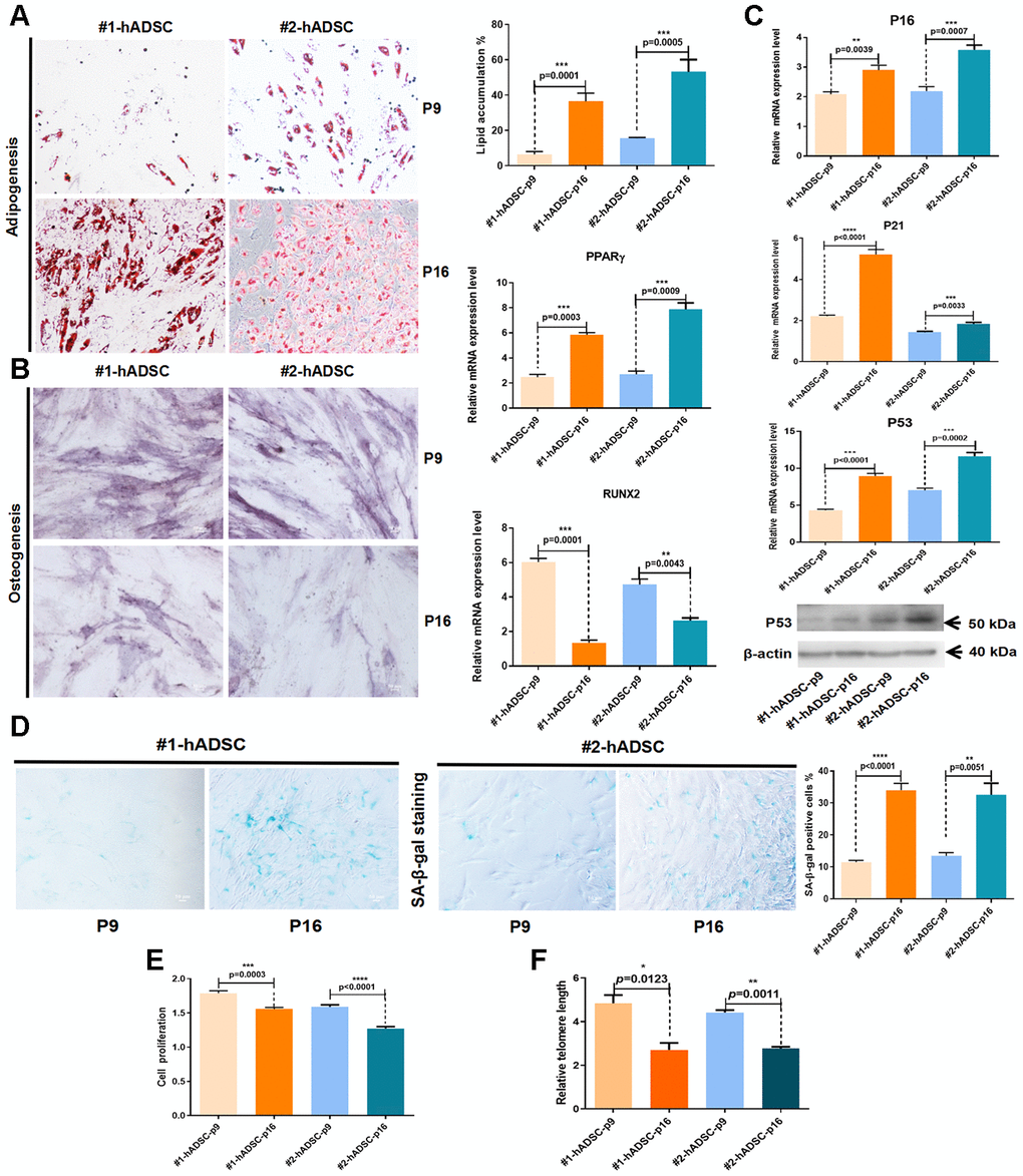 The high abundance of hADSCs makes them the ideal source of adult stem cells in clinical and regenerative medicine. However, long-term culture of mesenchymal stem cells (MSCs) results in altered cell morphology, slower proliferation rates, and disruption of the balance between osteogenesis and adipogenesis [4, 5]. In our study, MSCs undergoing long-term proliferation displayed a significant increase in senescence, as evidenced by their shortened telomere length and increased expression of SA-β-gal, p16, p21, and p53. These results concur with the findings of previous studies [22, 23].