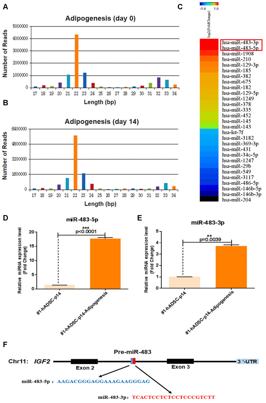 Apart from miR-1908, which has been reported to be highly expressed during adipogenic differentiation of hADSCs [19], we found that miR-483-3p and miR-483-5p expression were also significantly increased during adipogenesis (Figure 2C). To further verify these results, miR-483-5p and miR-483-3p expression were analyzed using RT-qPCR (Figure 2D, 2E). As pre-miR-483 is located in intron 2 of the IGF2 transcript and encodes two mature miRNAs (miR-483-3p/miR-483-5p) (Figure 2F), and IGF2 modulates the differentiation of stem cells [20, 21], we also measured the IGF2 expression using RT-qPCR. Consistently, IGF2 and miR-483 displayed similar expression pattern in adipogenic differentiated hADSCs that were isolated from two different donors and cultured under the same conditions (Supplementary Figure 2). Therefore, we speculated that miR-483 plays a vital role in the differentiation of hADSCs.