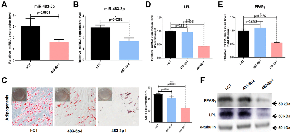 To further investigate the role of miR-483 in the differentiation of hADSCs, we transfected hADSCs with 483-3p-I (an inhibitor of miR-483-3p), 483-5p-I (an inhibitor of miR-483-5p), or negative control inhibitor (I-CT). The transfection efficiency was quantified at 48 hours after transfection by RT-qPCR. The success of the inhibition was demonstrated by low miR-483-5p and miR-483-3p expression (Figure 3A, 3B). We induced adipogenic differentiation of hADSCs transfected with 483-5p-I, 483-3p-I, or I-CT, then measured the adipogenic induction efficacy. It was found that inhibition of miR-483-5p and miR-483-3p in hADSCs decreased the number of lipid droplets (Figure 3C). To confirm these results, we investigated the expression of two primary adipogenic transcription factors, lipoprotein lipase (LPL) and peroxisome proliferator-activated receptor-gamma (PPARγ), by RT-qPCR (Figure 3D, 3E) and western blot analysis (Figure 3F). Compared with the control group, the mRNA and protein levels of LPL and PPARγ were significantly decreased in the 483-3p-I group, but not in the 483-5p-I group. Because miR-483-3p had the stronger effect of the two miRNAs, we selected it for further characterization.
