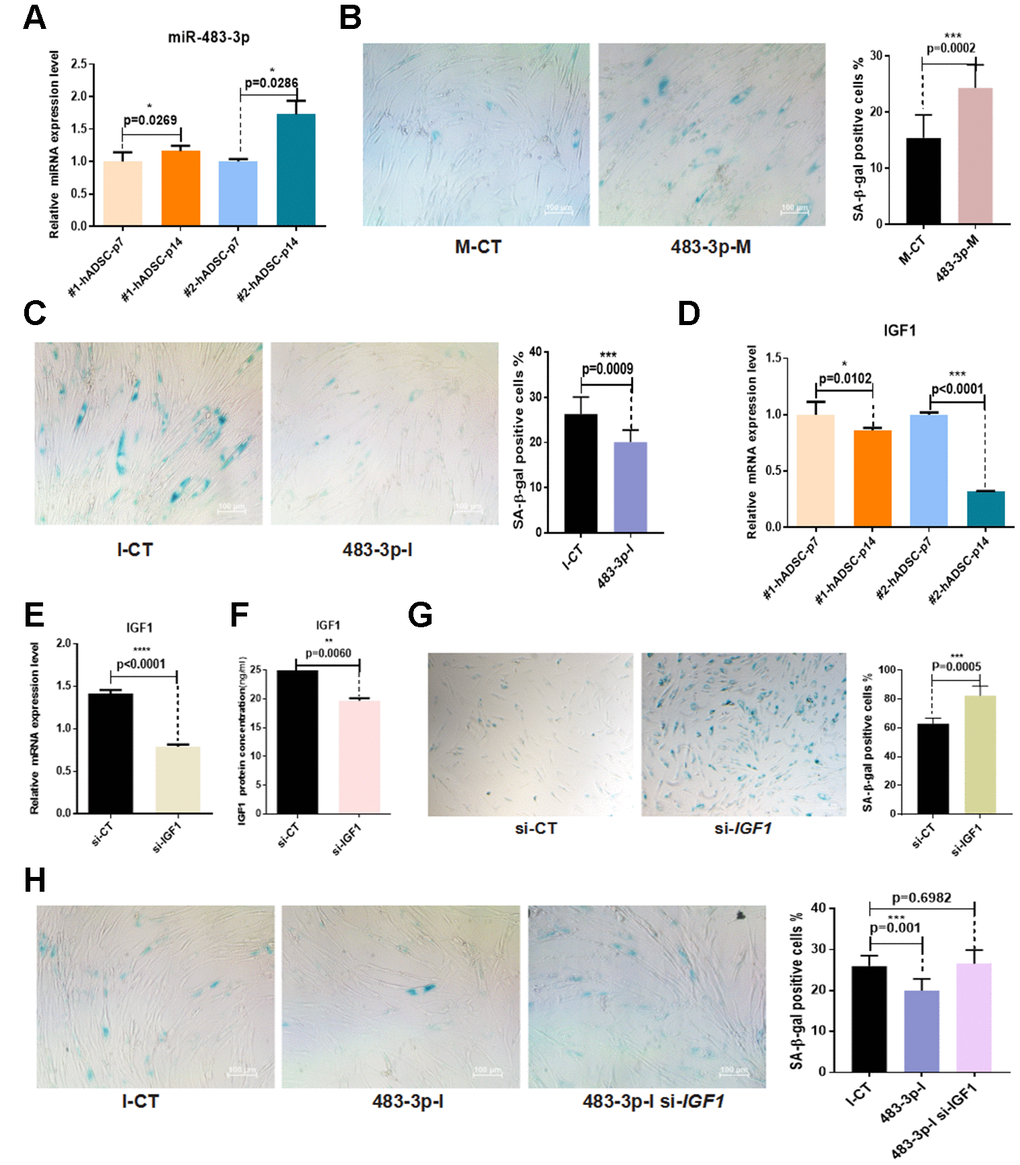 Based on these results, we transfected hADSCs with the small interfering RNA (siRNA) si-IGF1 to inhibit endogenous IGF1 expression. The results of RT-qPCR and ELISA showed that si-IGF1 effectively reduced IGF1 expression (Figure 5E, 5F). Additionally, the SA-β-gal activity of the si-IGF1 transfection group was significantly higher than that of the si-NC group (Figure 5G).