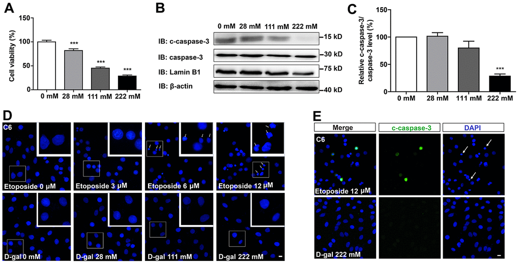 To examine the effects of D-gal on GBM cells, C6 cells were treated with different concentrations of the compound for 8 days. As shown in Figure 1A, D-gal reduced cell viability in a concentration-dependent manner. Particularly, 222 mM of D-gal resulted in a more significant reduction of C6 cell viability than other concentrations. Surprisingly, results from western blot analysis showed that cleaved-caspase-3 (c-caspase-3)/caspase-3 level was significantly decreased in D-gal-treated groups, compared to the control group (Figure 1B, 1C), indicating that the reduction in cell viability by D-gal was not due to apoptosis of C6 cells, but owing to anti-apoptosis effects observed in these cells. In addition, immunostaining of the nucleus and c-caspase-3 also confirmed that D-gal treatment did not cause apparent apoptosis of C6 cells, whereas etoposide (a DNA-damage drug) treatment could induce significant apoptosis of these cells (Figure 1D, 1E). Taken together, these results suggest that D-gal decreases cell viability, not due to induction of apoptosis in GBM cells.