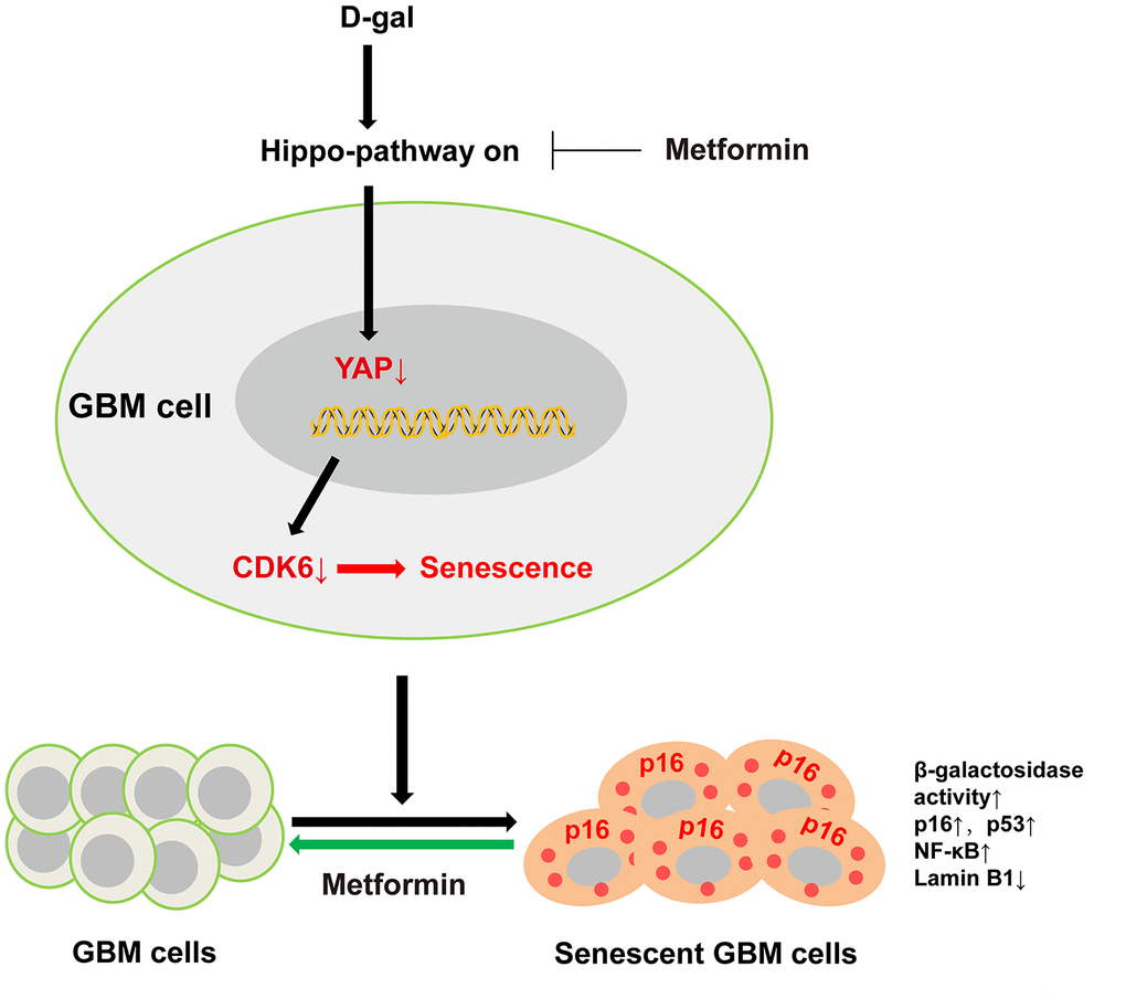 In the present study, we successfully established a new method for inducing GBM cell senescence using D-gal, and revealed that D-gal induced GBM cell senescence through the YAP-CDK6 signaling pathway. Moreover, our results show that metformin, an anti-ageing agent, can effectively reverse D-gal-induced senescence in GBM cells (Figure 10). This method can be utilized to explore the underlying mechanisms of GBM cell senescence, and to screen promising anti-aging drugs for GBM treatment.