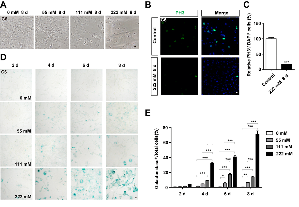 To examine whether D-gal can induce the senescence of GBM cells, C6 cells were treated with different concentrations of the compound for 8 days. As expected, the growth potential of treated cells was significantly inhibited in a concentration dependent manner, relative to the control (Figure 2A). Moreover, C6 cells exposed to 111 mM or 222 mM D-gal displayed a hypertrophic, thick and flattened morphology, which was the characteristic of cellular senescence (Figure 2A). Since cell cycle arrest and inhibition of proliferation are hallmarks of cellular senescence [7], we performed immunostaining of PH3 and Ki67 (both are markers for cell proliferation), and found a reduction in PH3 and Ki67 positive cells, indicating that D-gal treatment inhibited the proliferation of C6 cells (Figure 2B, 2C, Supplementary Figure 1A, 1B). According to previous reports, the most commonly used approach for detecting senescent cells is β-galactosidase staining [9]. Indeed, as shown in Figure 2D, 2E, D-gal treatment significantly increased β-galactosidase positive cells in a concentration- and time-dependent manner. Particularly, D-gal at a concentration of 222 mM for 8 days was optimal for induction of senescence in C6 cells, and was used for subsequent experiments. Taken together, these results suggest that D-gal induces premature senescence of GBM cells.