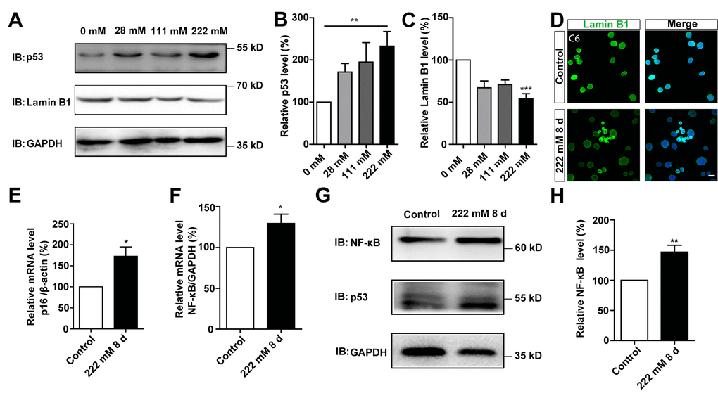 Next, we performed biochemical and cellular analyses to further understand D-gal-induced senescence in GBM cells. During the ageing process, cells show increased expression of p53 and p16 [10], and decreased expression of Lamin B1 [11]. Expression of p53 and Lamin B1 were therefore detected in C6 cells treated with different concentrations of D-gal for 8 days. As expected, analysis of western blots showed a significant increase in p53 protein levels in D-gal-treated C6 cells, whereas those of Lamin B1 significantly decreased, in a concentration-dependent manner (Figure 3A–3C). In addition, as shown in Figure 3D, immunostaining showed that the level of Lamin B1 was decreased in D-gal-treated C6 cells. Conversely, the mRNA level of p16 was significantly increased in D-gal-treated C6 cells (Figure 3E). Studies have shown that presence of SASP is a common result of cell senescence [7, 12], and is mediated by multiple inflammatory factors, such as the transcription factor NF-κB [25]. In this study, we evaluated expression of NF-κB and found significantly elevated levels of both its mRNA and protein after D-gal treatment (Figure 3F–3H). To investigate whether the appearance of the senescence of GBM could be reversed or eliminated, D-gal was removed after cellular senescence, we found that C6 cells could recover from senescence gradually (Supplementary Figure 2). This indicates that the type of senescence induced by D-gal in GBM cells is transient, and can be reversed. It is therefore belongs to beneficial senescence, and may be an effective strategy for GBM suppression and treatment. Taken together, these results further suggest that D-gal induces the senescence of GBM cells.