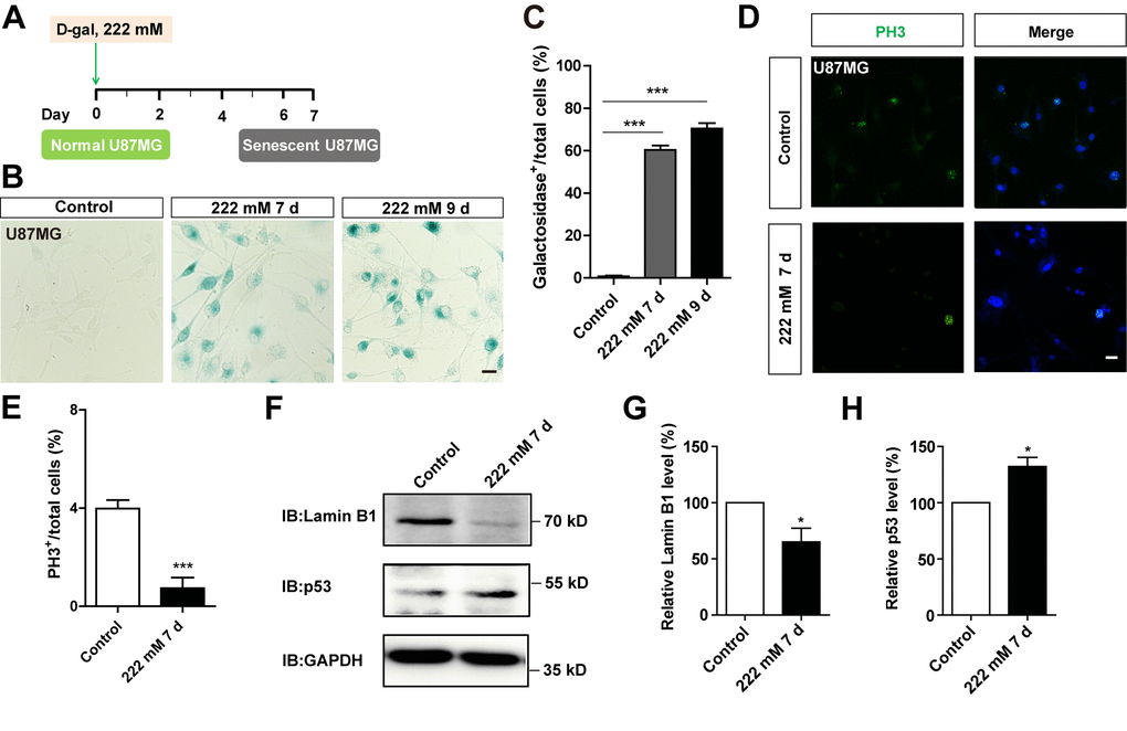 To determine whether D-gal-induced C6 cell senescence can be applicable to other GBM cell lines, the aforementioned experiments were performed in U87MG cells. As expected, we found that D-gal could also induce senescence of U87MG cells. Treatment of these cells with 222 mM D-gal for 7 days or 9 days resulted in a significant increase in the percentage of β-galactosidase-positive U87MG cells, at 60.36 ± 2.020 % and 70.43 ± 2.535 %, respectively (Figure 4A–4C). In addition, as shown in Figure 4D, 4E and Supplementary Figure 1C, 1D, the percentage of PH3 or Ki67 positive cells was significantly decreased, indicating that D-gal treatment reduced the proliferation of U87MG cells. Western blots further showed a significant elevation of p53 protein levels in D-gal-treated U87MG cells, whereas those of Lamin B1 showed a significant decrease (Figure 4F–4H). However, D-gal, even at high concentration, failed to induce senescence of SH-SY5Y cells, a neuroblastoma cell line (Supplementary Figure 3A, 3B), although etoposide also failed to induce senescence of SH-SY5Y cells (Supplementary Figure 3C, D). Taken together, these results suggest that D-gal is capable of inducing senescence of another GBM cell line, U87MG cells, but not SH-SY5Y cells.