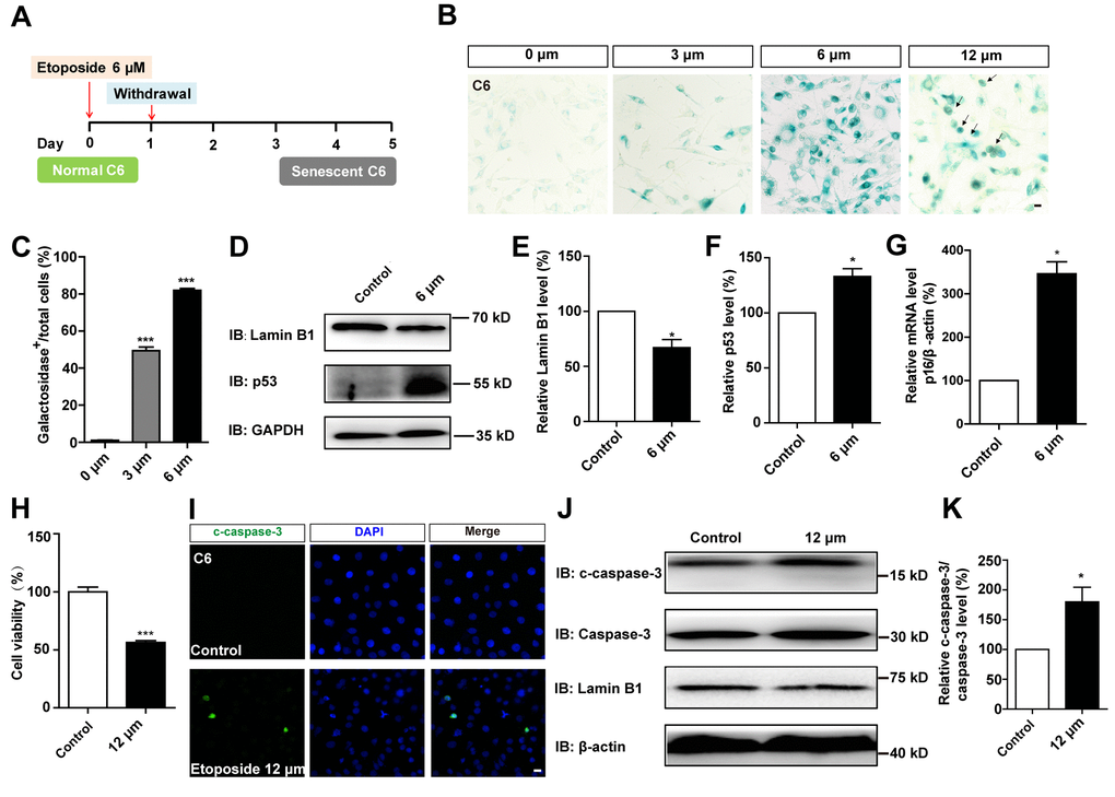 To compare the effects of D-gal-induced senescence in GBM cells with other drugs, C6 cells were treated with etoposide, a DNA-damage drug that is also used to induce senescence in other systems, such as mouse embryonic fibroblast cells (MEFs), mouse melanoma cells (B16F10), and human foreskin fibroblast cells (BJ) [26]. C6 cells were exposed to different concentrations of etoposide for 1 day, then recovered for another 4 days. Our results showed that 6 μM etoposide was the optimum concentration for inducing senescence (Figure 5A–5C). Western blot analysis further showed that the protein level of Lamin B1 was reduced, while p53 was elevated in etoposide-treated C6 cells (Figure 5D–5F). Moreover, qPCR analysis showed that the mRNA level of p16 was significantly increased in these etoposide-treated C6 cells (Figure 5G). However, the senescent cells were accompanied by apparent cell apoptosis, even at 6 μM (Figure 1D, 1E). Cells exposed to higher concentrations of etoposide exhibited obvious signs of toxicity, including decreased viability (Figure 5H) and increased apoptosis (Figure 5I–5K and Figure 1E). Therefore, D-gal was more effectively to induce the senescence of GBM cells than etoposide.