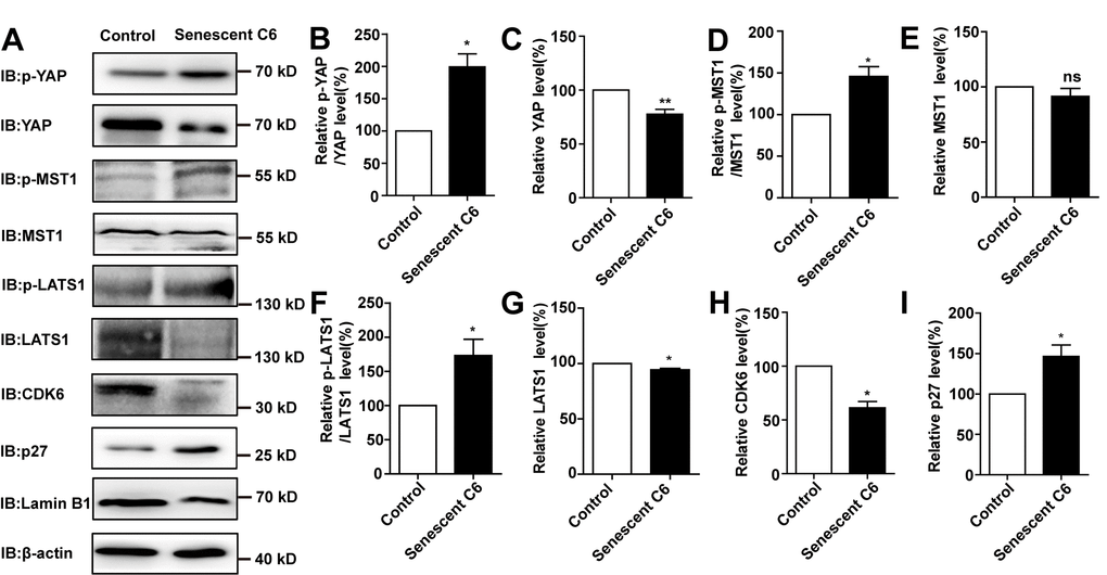 Western blot analysis was carried out as previously described [58]. Briefly, C6 or U87MG cells were lysed by ice-cold RIPA Buffer (P0013B, Beyotime) and incubated at 4 °C for 30 min. Proteins were extracted using 5× loading buffer, following centrifugation at 12, 000 ×g for 30 min, and boiled at 100°C for 8-10 min. The proteins were then separated using 10-12% sodium dodecyl sulfate-polyacrylamide gel electrophoresis (SDS-PAGE) and transferred into nitrocellulose membranes (Life sciences, USA). After blocking in TBST containing 5% skimmed milk for 1 h, the immunoblots were incubated at 4°C overnight with different primary antibodies. Primary antibodies used included rabbit anti-caspase-3 (#13008, CST, 1:1, 000), rabbit anti-cleaved caspase-3 (#9579, CST, 1:1, 000), rabbit anti-Lamin B1 (ab16048, Abcam, 1 : 1, 000), rabbit anti-p53(bs-2090R, Bioss, 1:1,000), rabbit anti-NF-κB (ab16502, Abcam, 1 : 1, 000), mouse anti-YAP (WH0010413M1, Sigma-Aldrich, 1:1, 000), rabbit anti-p-YAP (#13008, CST, 1:1, 000), rabbit anti-LATS1 (#3477, CST, 1:1000), rabbit anti-p-LATS1 (ser909) (#9157, CST, 1:1000), rabbit anti-MST1 (#3682, CST, 1:1000), rabbit anti-p-MST1/2 (Thr183/Thr180) (#49332, CST,1:1, 000), mouse anti-CDK6 (#3136T, CST, 1:1,000), and mouse anti-p27kip1 (#3698, CST, 1:1, 000). Rabbit anti-GAPDH (#2118, CST, 1:5, 000) or mouse anti-β-actin (A5316, Sigma-Aldrich, WB 1:10, 000) as a loading control was detected alongside the experimental samples. The membranes were subsequently washed three times in TBST, and incubated with the horseradish peroxidase (HRP) conjugated secondary antibodies for 1 h. After a further 3-time wash in TBST, the protein signals were detected using the ECL detection kit (Bio-Rad, USA) and analyzed using Quantity One software (Bio-Rad).