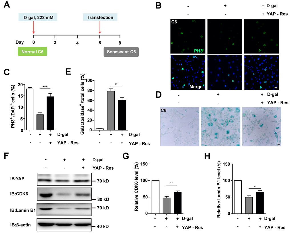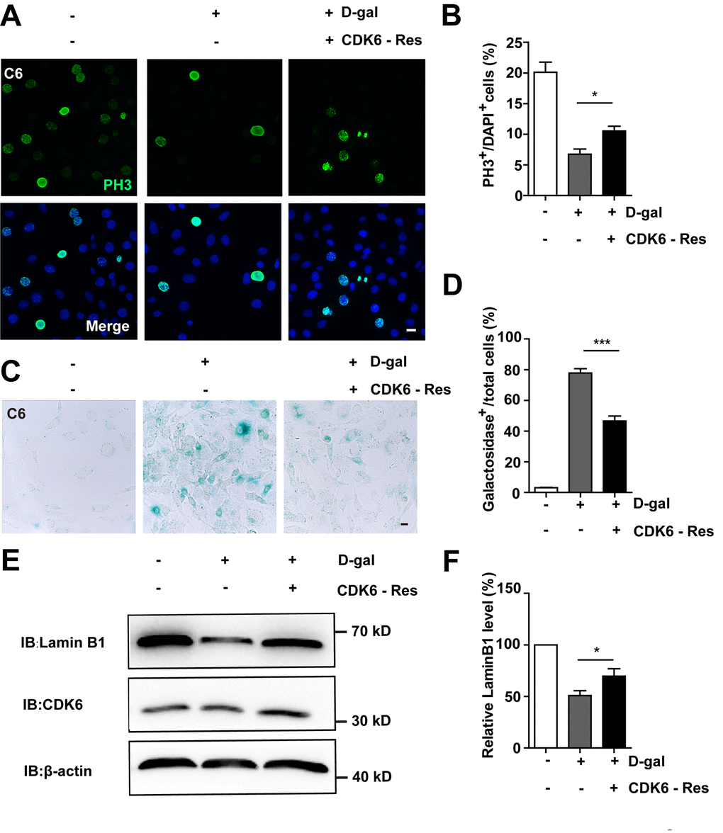 Then CDK6 rescue experiments were performed. Overexpression of CDK6 indeed restored cell proliferation (Figure 8A, 8B), as well as restored D-gal-induced senescence of C6 cells (Figure 8C–8D). Moreover, overexpression of CDK6 also significantly restored D-gal-induced decrease in Lamin B1 expression (Figure 8E, 8F). Taken together, these results suggest that D-gal induces senescence of GBM cells by inactivating the YAP-CDK6 pathway.