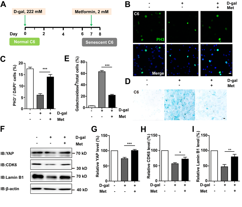 To determine whether D-gal-induced GBM cell senescence can be reversed, metformin, a promising anti-ageing agent [27], was applied in the senescent C6 cells (Figure 9A). As expected, metformin significantly restored cell proliferation (Figure 9B, 9C) as well as ameliorated D-gal-induced senescence of C6 cells (Figure 9D, 9E). Interestingly, metformin treatment also significantly restored D-gal-induced reduction in the expression of YAP, CDK6, and Lamin B1 (Figure 9F–9I). Taken together, these results suggest that metformin could reverse D-gal-induced GBM cell senescence by activating the YAP-CDK6 signaling pathway.