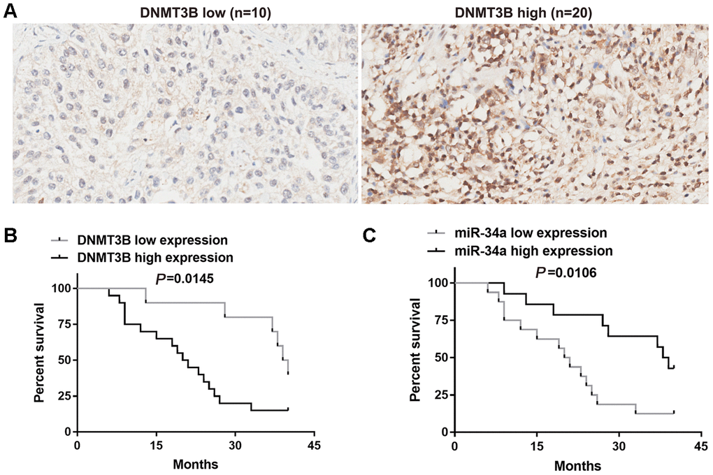 The bladder cancer patients were divided into two groups by the protein levels of DNMT3B. Overall survival was assessed using the Kaplan-Meier method and the logrank test. The median survival time in the group with low DNMT3B expression (n=10) was 39.5 months (Figure 1B), and that in the group with high DNMT3B expression (n=20) was 20.5 months (Figure 1B). This indicated that patients with lower expression of DNMT3B had a longer overall survival compared to those with higher expression of DNMT3B (Figure 1B). Thereafter, we assessed the level of miR-34a expression in the 30 bladder cancer tissues. Based on the median miR-34a level, bladder cancer tissues were divided into low-miR-34a-expression group and high-miR-34a-expression group. The median survival time in the low-miR-34a-expression group (n=16) was 20.5 months (Figure 1C), and that in the high-miR-34a-expression group (n=14) was 38.5 months (Figure 1C). This indicated that patients with higher expression of miR-34a had longer overall survival compared to those with lower expression of miR-34a (Figure 1C).