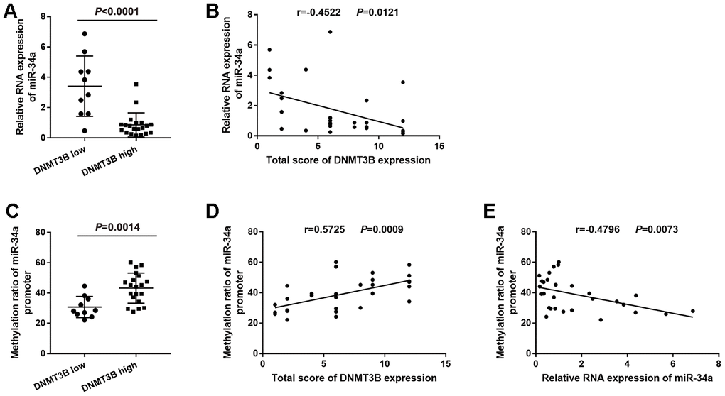 According to the level of DNMT3B protein expression, bladder cancer tissues were divided into the low-DNMT3B-expression group and the high-DNMT3B-expression group. miR-34a expression was higher in bladder cancer tissues with low DNMT3B expression compared to those with high DNMT3B expression (Figure 2A). Furthermore, the level of miR-34a was negatively correlated with the level of DNMT3B based on the linear regression analysis (r=-0.4522, P=0.0121, Figure 2B).