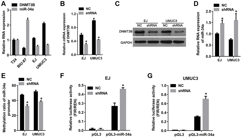 To verify this hypothesis, we first analyzed the correlation between DNMT3B and miR-34a in bladder cancer tissues. Our data revealed that the level of miR-34a was negatively correlated with the level of DNMT3B. In addition, the methylation ratio of the miR-34a promoter was positively correlated with the level of DNMT3B and negatively correlated with the level of miR-34a. These results indicate that DNMT3B might suppress miR-34a expression by increasing the methylation ratio of the miR-34a promoter. DNMT3B overexpression in BIU-87 cells decreased miR-34a expression, increased miR-34a promoter methylation, and decreased the transcriptional activity of the miR-34a promoter, which also support our hypothesis. In addition, DNMT3B knockdown increased miR-34a expression, decreased miR-34a promoter methylation, and increased the transcriptional activity of the miR-34a promoter in both EJ and UMUC3 cells. All these results demonstrate that DNMT3B silencing decreases the methylation of the miR-34a promoter in vitro, resulting in the enhancement of miR-34a transcription. These results also support our above hypothesis.