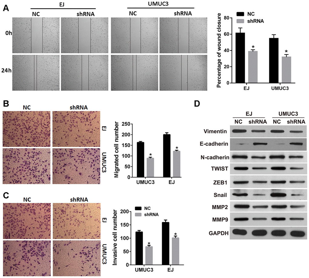 In order to investigate whether DNMT3B was involved in the migration and invasion of bladder cancer, we evaluated the effects of DNMT3B knockdown on the migration, invasion, and EMT in EJ and UMUC3 cells. The results of the wound healing assay revealed that the percentage of wound closure was decreased in the shRNA groups of EJ and UMUC3 cells (Figure 4A) compared to those in the NC groups. The Transwell assays revealed that the numbers of migrated and invasive cells in the shRNA groups of EJ and UMUC3 cells were lower than those of the NC groups (Figure 4B and 4C). These results suggested that DNMT3B knockdown resulted in decreased migration and invasion capabilities in EJ and UMUC3 bladder cancer cell lines. Furthermore, the expression of vimentin, N-cadherin, Snail, twist family bHLH transcription factor 1 (TWIST1), zinc finger E-box binding homeobox 1 (ZEB1), matrix metallopeptidase 2 (MMP2), and MMP9 was decreased, and the expression of E-cadherin was increased in the shRNA groups of EJ and UMUC3 cells (Figure 4D). Together, our data indicate that the suppression of DNMT3B inhibits EMT in bladder cancer cells.