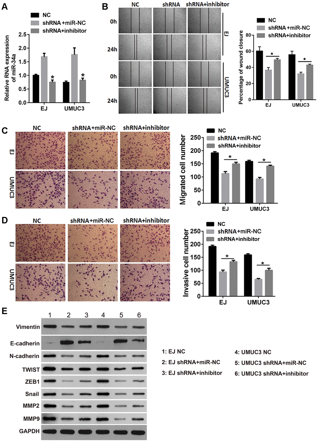 We next investigated whether inhibiting miR-34a rescued the inhibitory effects of DNMT3B knockdown on the migration, invasion, and EMT in bladder cancer cells. After transfecting the miR-34a inhibitor into the shRNA groups of EJ and UMUC3 cells, the miR-34a level was verified by quantitative reverse transcription polymerase chain reaction (qRT-PCR). As shown in Figure 5A, the miR-34a level was lower in the shRNA groups of EJ and UMUC3 cells transfected with the miR-34a inhibitor compared to those transfected with the negative control microRNA (miR-NC), indicating that the miR-34a inhibitor successfully attenuated the effect of DNMT3B knockdown on miR-34a. Additionally, the percentage of wound closure increased in the shRNA groups of EJ and UMUC3 cells transfected with the miR-34a inhibitor compared to those transfected with miR-NC (Figure 5B). The Transwell assays showed increased numbers of migrated and invasive cell in the shRNA groups of EJ and UMUC3 cells transfected with the miR-34a inhibitor compared to those transfected with miR-NC (Figure 5C and 5D). The expression of vimentin, N-cadherin, Snail, TWIST1, ZEB1, MMP2, and MMP9 was increased, and the expression of E-cadherin was decreased in the shRNA groups of EJ and UMUC3 cells transfected with the miR-34a inhibitor, compared to those transfected with miR-NC (Figure 5E). These results reveal that inhibiting miR-34a reduced the inhibitory effects of DNMT3B knockdown on migration, invasion, and EMT.