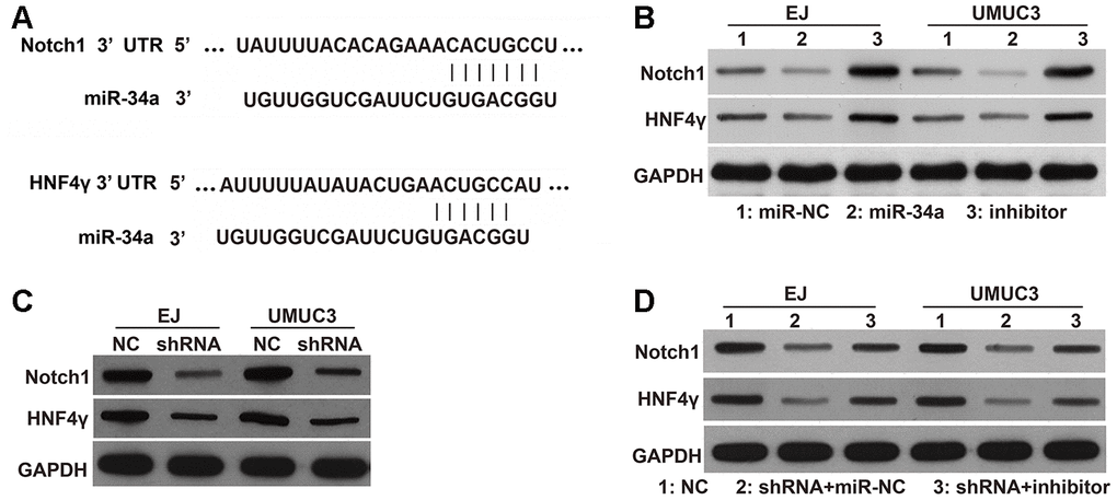 To further investigate the underlying mechanisms of DNMT3B, we examined the expression of the downstream targets of miR-34a. Several studies have indicated that miR-34a modulates the migration and invasion of tumor cells by down-regulating hepatocyte nuclear factor 4 gamma (HNF4γ) and Notch1 [14–16]. As shown in Figure 1A, miR-34a has binding sites on the 3’ untranslated region (UTR) of HNF4γ and Notch1 mRNAs. miR-34a can downregulate the protein levels of HNF4γ and Notch1 in bladder cancer and endometrial cancer cells [14–16]. In this study, we further confirmed their targeted regulatory pathways in EJ and UMUC3 cells. The protein levels of HNF4γ and Notch1 were decreased in miR-34a-mimic transfected cells and increased in miR-34a-inhibitor transfected cells. These results indicate that HNF4γ and Notch1 are downstream targets of miR-34a in EJ and UMUC3 cells (Figure 6B). As shown in Figure 6C, the protein levels of HNF4γ and Notch1 were lower in the shRNA groups of EJ and UMUC3 cells compared to those in the NC groups, indicating that DNMT3B knockdown could decrease the protein levels of HNF4γ and Notch1 protein levels. Moreover, the protein levels of HNF4γ and Notch1 were higher in the shRNA groups of EJ and UMUC3 cells transfected with miR-34a inhibitor, compared to those transfected with miR-NC (Figure 6D), indicating that inhibiting miR-34a attenuated the inhibitory effects of DNMT3B knockdown on the downstream targets of miR-34a.