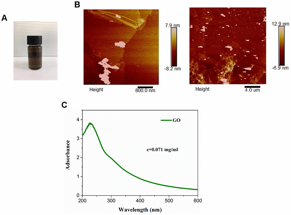 The color of commercial GO dispersion varied from yellow to brown (Figure 1A). The optical absorption spectra of GO showed absorption peaks at approximately (Figure 1B). As determined by atomic force microscopy, GO was 3-4 nm in thickness and 100-200 nm in diameter (Figure 1C), suggesting the formation of single or a few layers of GO nanosheets (Figure 1).