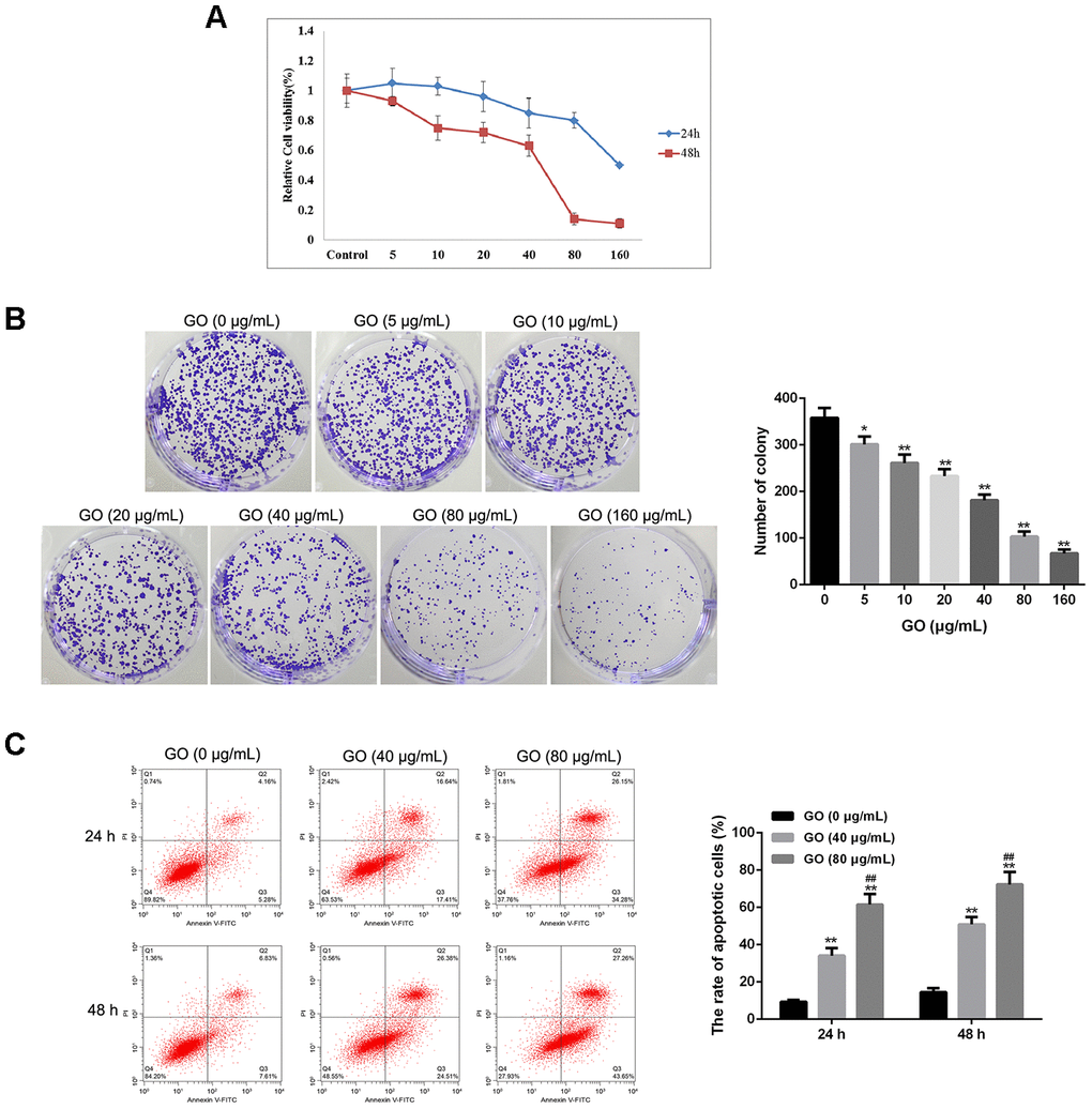 MTT assay showed that GO significantly inhibited cell viability in a dose-dependent manner both at 24 and 48 h, and the half maximal inhibitory concentration (IC50) was about 40 μg/mL (Figure 2A). Consistently, colony forming assay result also revealed that compared with control cells, the number of clones was obviously decreased in Hela cells treated with GO in a dose-dependent manner (Figure 2B). In addition, flow cytometry analysis found that the rate of apoptotic cells was remarkably increased after GO treatment in a dose-dependent manner both at 24 and 48 h in Hela cells compared with control cells (p < 0.01, Figure 2C). (Figure 2).