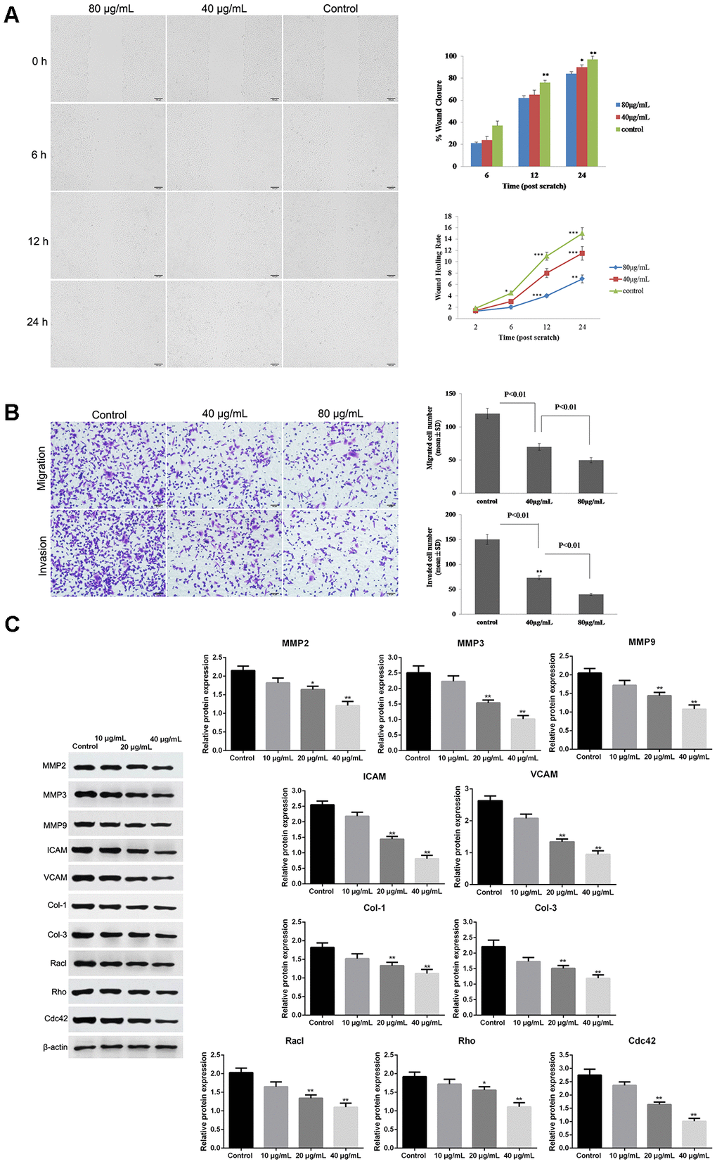 Wound healing assay showed that GO significantly decreased the wound closure and inhibited wound healing rate of Hela cells in dose- and time-dependent manner (p < 0.05, Figure 3A), suggesting a reduced migration tendency after GO treatment in Hela cells. Transwell assay also revealed that cell migration and invasion were dramatically suppressed in Hela cells treated with GO compared with control cells (p < 0.05, Figure 3B). Meanwhile, the expression of metastasis-related proteins, including MMP2, MMP3, MMP9, ICAM, VCAM, Col-1, Col-3, Racl, Rho and Cdc42, was detected by western blotting. The results demonstrated that GO treatment remarkably inhibited the protein levels of MMP2, MMP3, MMP9, ICAM, VCAM, Col-1, Col-3, Racl, Rho and Cdc42 in a dose-dependent manner compared with control Hela cells (p < 0.05, Figure 3C). (Figure 3)