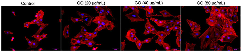 Hela cells were inoculated on cover slips, and then exposed to 0, 20, 40 and 80 μg/mL GO, respectively for 24 h. The cells were then fixed using 4% paraformaldehyde and permeabilized with 0.1% Triton X-100. After blockage with 2% bovine serum albumin, the cells were stained with 5-TAMRA- Phalloidin to visualize actin (red) and DAPI to identify nuclei (blue). Finally, cell images were obtained using laser scanning confocal microscope (Olympus, Japan).
