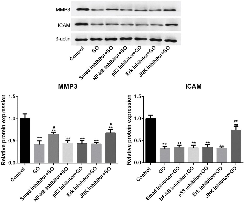 Furthermore, we detected the expression of metastasis-related proteins, including MMP2, MMP3, MMP9, ICAM, VCAM, Col-1, Col-3, Racl, Rho and Cdc42, in Hela cells treated with and without GO. Of them, MMPs, MMP2, MMP3 and MMP9 could induce tumor cell invasion and migration by promoting the degradation of extracellular matrix, such as collagen [25]. ICAM and VCAM, both categorized as adhesion factors, could strengthen the adhesion between tumor cells and endothelial cells through specific binding to the receptors on the cells, thereby promoting tumor cell invasion and migration [26]. In addition, Rho protein family, consisting of Racl, Rho and Cdc42, can modulate cytoskeleton and cell adhesion, thereby playing an important role in promoting malignant transformation of cells as well as tumor invasion and metastasis [27]. Consistently, our study revealed that GO inhibited the expression of these metastasis-related proteins. In addition, we found that MMP3 expression was downregulated by Smad and JNK pathways, and ICAM expression was downregulated by JNK pathway. Thus, we speculated that the inhibiting effects of GO on cell migration and invasion might be closely associated with Smad and JNK pathways via downregulating MMP3 and ICAM.
