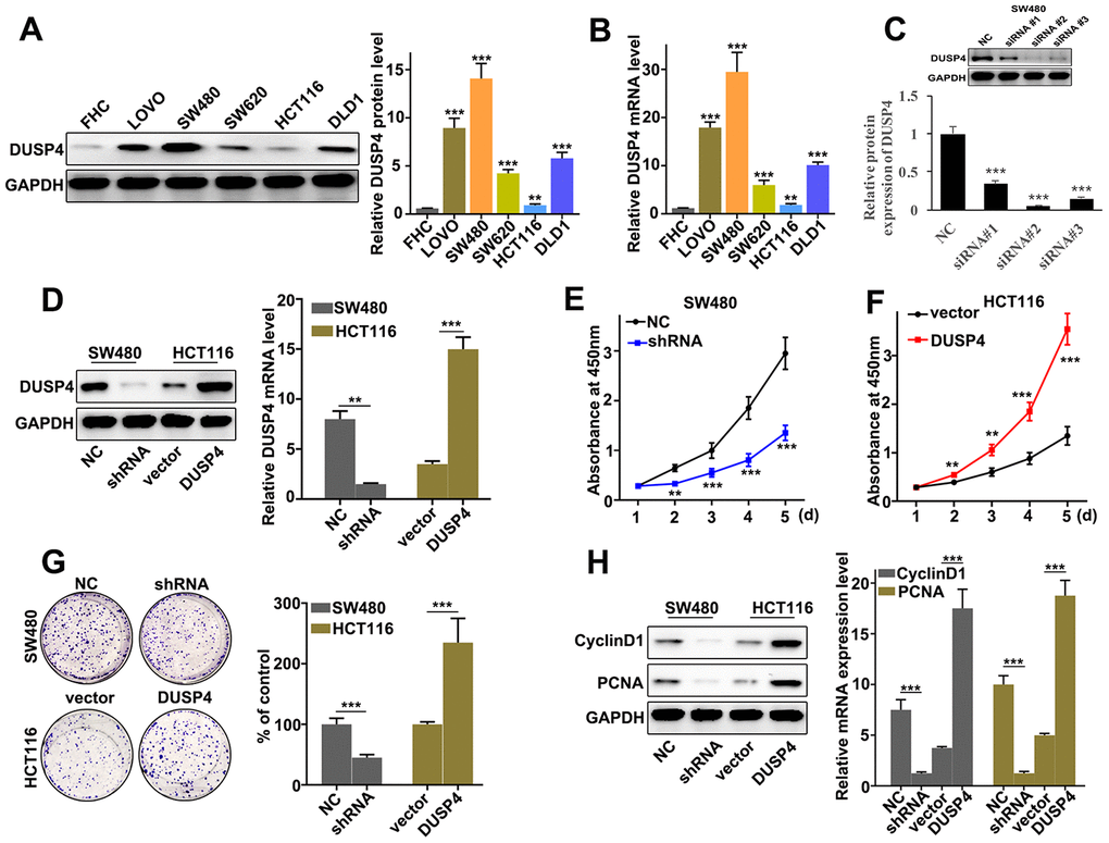 In order to further probe the biological role of DUSP4 in colorectal cancer cells, DUSP4 expression was assessed in six selected cell lines, namely FHC, LOVO, SW480, SW620, HCT116, and DLD1. Western blot and qRT-PCR analysis indicated that DUSP4 protein expression was significantly different between each line (Figure 2A and 2B). It was notable that DUSP4 protein expression was at the lowest level in HCT116 cells (P<0.01), and at the highest level in SW480 cells (P<0.001). Therefore, HCT116 and SW480 cells were selected into next study. The two kinds of cells underwent DUSP4 over-expressed and knocked-down, respectively. Figure 2C showed that siRNA #3 was an effective molecular for DUSP4 knockdown protein expression in SW480 cells, so the siRNA # 3 treated SW480 cells were used to do analysis. Meanwhile, western blot analysis was employed to determine the DUSP4 protein expression in HCT116 and SW480 cells under different treatments. Figure 2D suggested a success respectively in the overexpression and knockdown of DUSP4 in HCT116 and SW480 cells. In term of cell proliferation analysis, DUSP4 knockdown could significantly reduce cell proliferation in SW480 cells compared to normal SW480 cells on day 2, 3, 4, 5 (Figure 2E) (P<0.01). However, DUSP4 overexpression could significantly promote cell proliferation in HCT116 cells compared to vector-treated HCT116 cells on day 2, 3, 4, 5 (Figure 2F) (P<0.01). Moreover, cell colony numbers were significantly increased in DUSP4 over-expressed HCT116 cells compared to vector-treated HCT116 cells (Figure 2G) (P<0.01), but were significantly decreased in DUSP4 knocked-down SW480 cells compared to normal SW480 cells (Figure 2G) (P<0.01). Meanwhile, cell proliferation-related biomarkers such as CyclinD1 and PCNA in DUSP4 knocked-down SW480 cells and DUSP4 over-expressed HCT116 cells were detected by western blot and qRT-PCR. The results suggested that the expression of CyclinD1 and PCNA was lower in DUSP4 knocked-down SW480 cells than in normal SW480 cells (P<0.05) (Figure 2H), but was higher in DUSP4 over-expressed HCT116 cells than in normal HCT116 cells (P<0.05) (Figure 2H). In summary, in vitro, DUSP4 overexpression in HCT116 cells could promote metastasis and proliferation of colorectal cancer cells whereas DUSP4 knockdown in SW480 cells could restrain cell metastasis and proliferation.