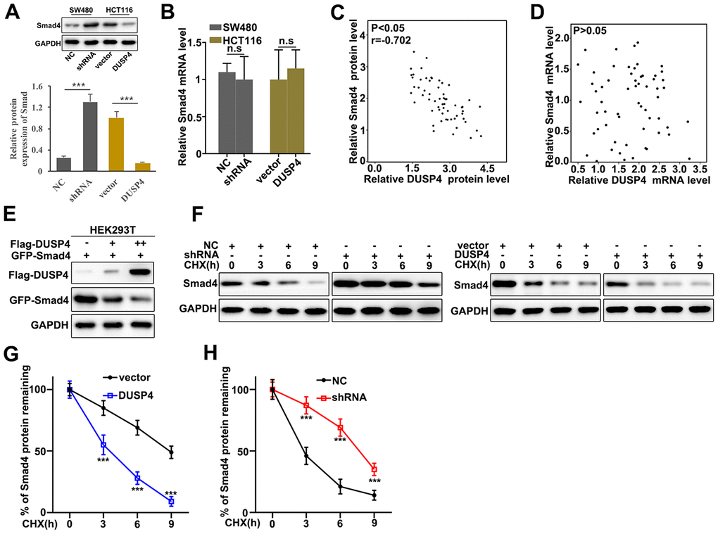 Potential relationships between the expressions of DUSP4 and Smad4 was assessed. Western blot and qRT-PCR were employed to investigate the protein and mRNA expressions in DUSP4 over-expressed HCT116 cells and DUSP4 knocked-down SW480 cells. Figure 4A showed that Smad4 expression was higher in DUSP4 knocked-down SW480 cells than in normal SW480 cells, but was less abundant in over-expressed HCT116 cells than in normal HCT116. It was notable that no difference of Smad4 mRNA abundance was detected in DUSP4 over-expressed HCT116 cells and DUSP4 knocked-down SW480 cells (Figure 4B). The above results suggested that DUSP4 could affect Smad4 protein expression but not Smad4 mRNA abundance. We also further analyzed the potential relationships of the mRNA and protein expressions of DUSP4 and Smad4 in clinical samples (Figure 4C and 4D). The results suggested a possible correlation between the protein expressions of DUSP4 and Smad4 (Figure 4C), but no correlation between the mRNA expressions of DUSP4 and Smad4 (Figure 4D). Based on the facts above, we employed DUSP4 and Smad4 to transfect HEK293T cells to probe the potential relationships between protein expressions of DUSP4 and Smad4. Figure 4E showed the negative correlation between protein expressions of DUSP4 and Smad4. Cycloheximide (CHX), which can inhibit protein synthesis, was also employed to study the relationships between protein expressions of DUSP4 and Smad4 in DUSP4 over-expressed HCT116 cells and DUSP4 knocked-down SW480 cells. Figure 4F–4H showed that DUSP4 overexpression in HCT116 cells could significantly reduce the remaining Smad4 protein in cells compared to normal HCT116 cells (Figure 4F and 4G) (P<0.01), and DUSP4 knocked-down SW480 cells could significantly promote the remaining Smad4 protein in cells compared to normal SW480 cells (Figure 4F and 4H) (P<0.01). In summary, DUSP4 protein expression was negatively related to Smad4 expression.