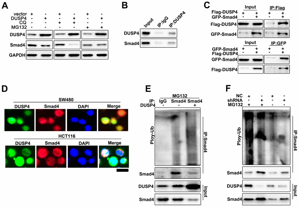 Potential relationships between DUSP4 ubiquitination and Smad4 in DUSP4 over-expressed HCT116 cells was evaluated. MG132 is an intracellular inhibitor of the proteasome degradation pathway, and Meanwhile, Chloroquine (CQ) is an inhibitor of the autophagolysosomal degradation pathway. Therefore, the two molecules were employed to study the protein expressions of DUSP4 and Smad4 in DUSP4 over-expressed HCT116 cells (Figure 5A). The results suggested that MG132 could effectively reduce Smad4 protein expression whereas CQ had no effect on Smad4 protein expression. Therefore, we speculated that DUSP4 could regulate Smad4 expression through the ubiquitination but not the cellular autophagy pathway. Furthermore, we examined the potential interaction between DUSP4 protein and Smad4 protein in cell, and Co-immunoprecipitation (Co-IP) was used Figure 5B showed that DUSP4 protein could interact with Smad4 protein. The forward and reverse protein Co-IP of DUSP4 protein and Smad4 protein in DUSP4 over-expressed HCT116 cells was carried out and the interaction between DUSP4 protein and Smad4 protein was further identified (Figure 5C). Immunofluorescence colocalization analysis of DUSP4 protein and Smad4 protein revealed that the spatial distribution of DUSP4 and Smad4 was overlapping. The result above further illustrated a mutual combination between DUSP4 and Smad4 in DUSP4 over-expressed HCT116 cells (Figure 5D). In addition, we carried out ubiquitination test in DUSP4 over-expressed HCT116 cells and DUSP4 knocked-down SW480 cells. It was showed that Smad4 ubiquitination degradation was promoted by the overexpression of DUSP4 in HCT116 cell line (Figure 5E), but was inhibited by the knockdown of DUSP4 in SW480 cells (Figure 5F). In summary, DUSP4 could regulate Smad4 gene expression through ubiquitination.