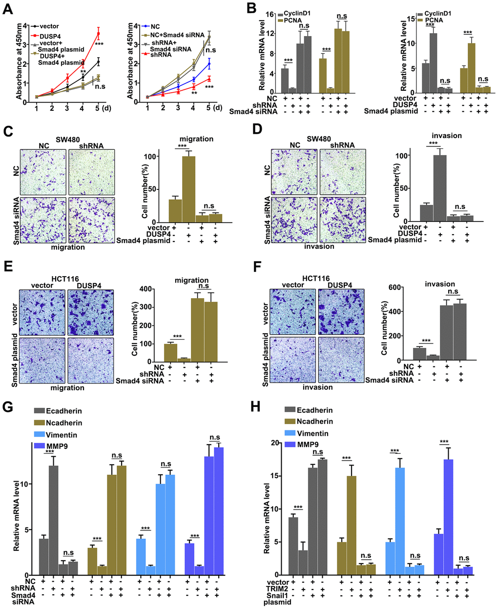 Total RNA was extracted with TRNzol Universal RNA Extraction Kit (TIANGEN BIOTECH(BEIJING)CO, LTD). The mRNA expression was detected with Bio-Rad IQ5 system. The PCR reaction contained 10μL GoldStar Probe Mixture (Low ROX) (CWBio, China), 1μL sense primer (10 nM), 1μL anti-sense primer (10 nM), 2μL cDNA template (10 ng), and 6μL H2O. The qRT-PCR program was set as following: 95°C, 30 seconds, 40 cycles (95°C, 5 seconds, and 60°C, 10 seconds). 2-ΔΔCt cycle method was used to calculate the relative expression level of mRNAs. GAPDH was employed as the internal control. Primer sequences were listed as follows: DUSP4: Forward Primer_GGCGGCTATGAGAGGTTTTCC, Reverse Primer_TGGTCGTGTAGTGGGGTCC; GAPDH: Forward Primer_TGTGGGCATCAATGGATTTGG, Reverse Primer_ACACCATGTATTCCGGGTCAAT; Smad4: Forward Primer_CTCATGTGATCTATGCCCGTC, Reverse Primer_AGGTGATACAACTCGTTCGTAGT; MMP9: Forward Primer_TGTACCGCTATGGTTACACTCG, Reverse Primer_GGCAGGGACAGTTGCTTCT; E-Cadherin: Forward Primer_CGAGAGCTACACGTTCACGG, Reverse Primer_GGGTGTCGAGGGAAAAATAGG; N-Cadherin: Forward Primer_TTTGATGGAGGTCTCCTAACACC, Reverse Primer_ACGTTTAACACGTTGGAAATGTG; Vimentin: Forward Primer_AGGCAAAGCAGGAGTCCACTGA, Reverse Primer_ATCTGGCGTTCCAGGGACTCAT; Cyclin D1: Forward Primer_GCTGCGAAGTGGAAACCATC, Reverse Primer_CCTCCTTCTGCACACATTTGAA; PCNA: Forward Primer_CCTGCTGGGATATTAGCTCCA, Reverse Primer_CAGCGGTAGGTGTCGAAGC.