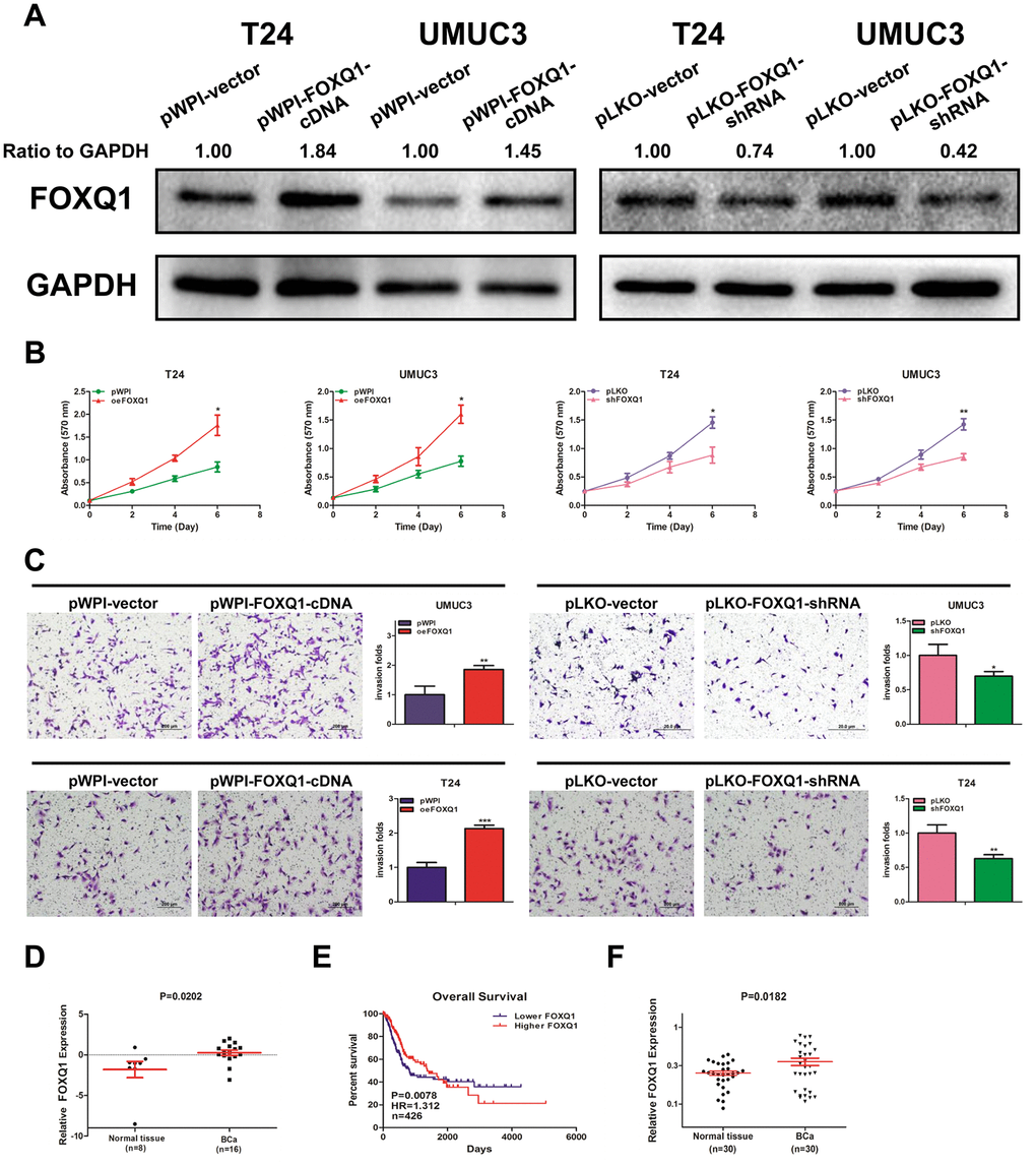 Knockdown of FOXQ1 inhibits the migration and invasion of BCa cells [22]. We conducted a western blot assay and confirmed that FOXQ1 was effectively upregulated or downregulated after transfection of functional FOXQ1-cDNA or FOXQ1-shRNA in T24 and UMUC3 cells, respectively (Figure 1A). Furthermore, a cell proliferation assay demonstrated that overexpression of FOXQ1 increased cell proliferation, while knockdown of FOXQ1 inhibited cell proliferation in T24 and UMUC3 cells (Figure 1B). A transwell invasion assay in T24 and UMUC3 cells revealed similar results (Figure 1C).